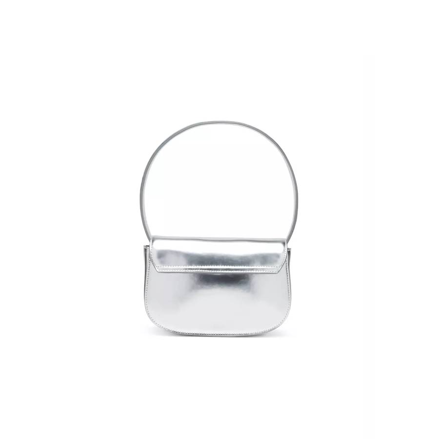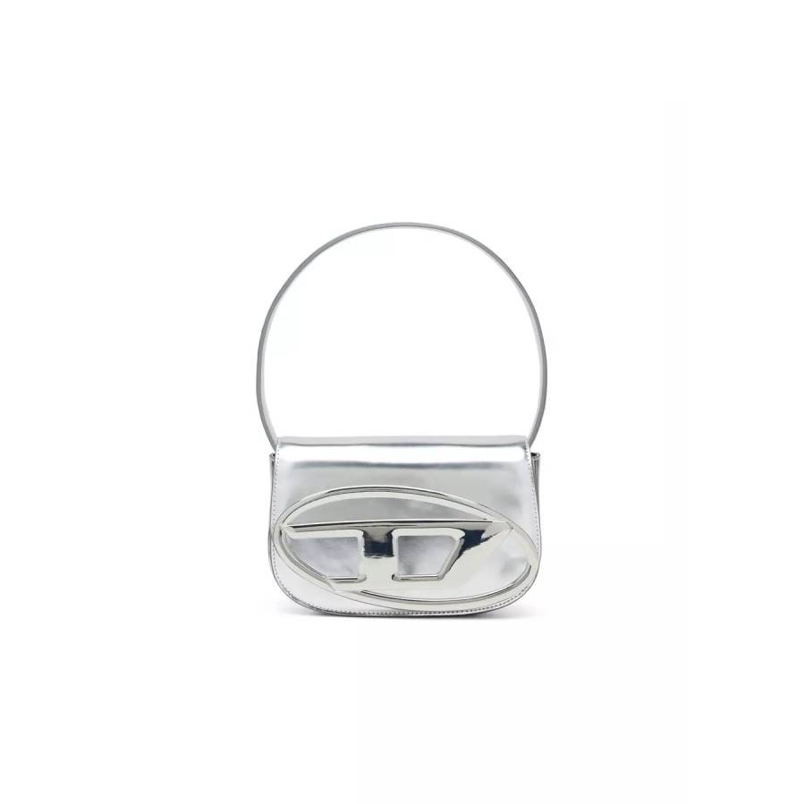 Structured and compact, this womens bag has a handle that fits over the shoulder and an optional strap for crossbody wear. The electroplated oval D plaque on the flap matches the glossy, mirrored-leather construction.