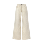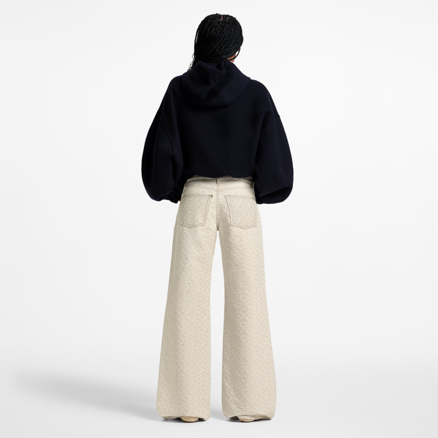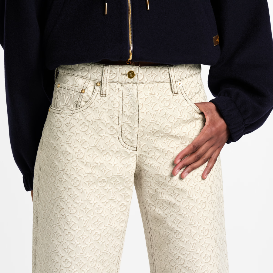 These jeans make a chic statement in an allover print of this season’s graphic trompe l’oeil 3D-effect Monogram motif, with contrasting topstitching highlighting the construction. They are cut from cotton gabardine in a clean wide-leg, high-rise silhouette. A metallic Monogram Flower button adds a playful finishing touch to the fly.
