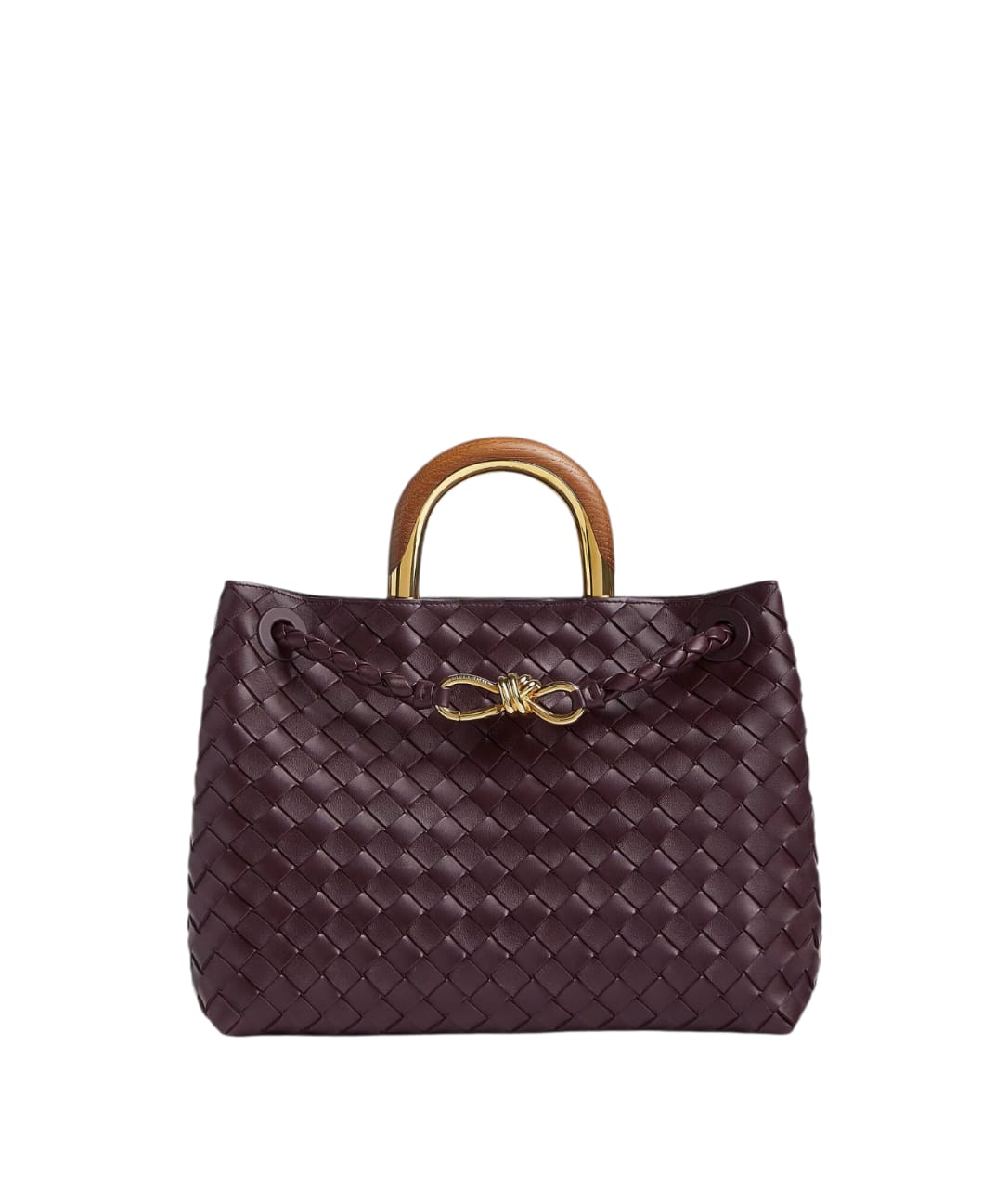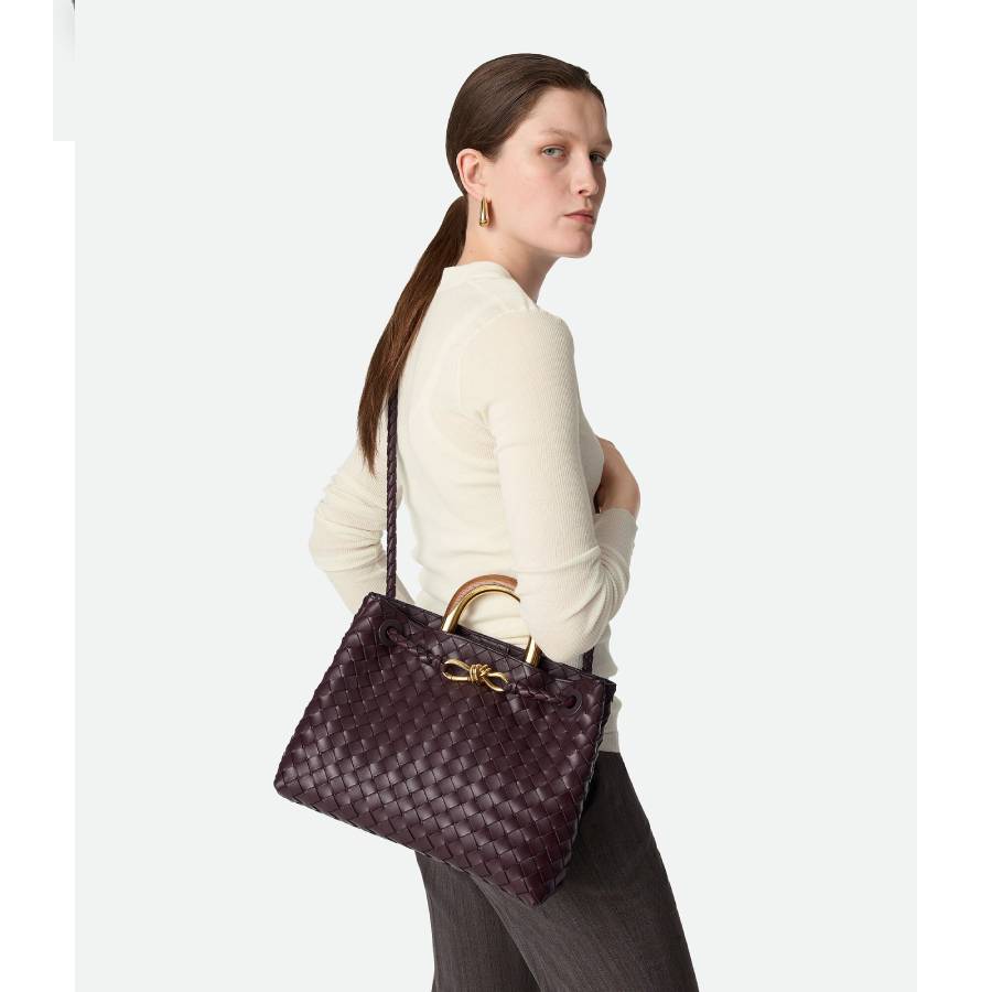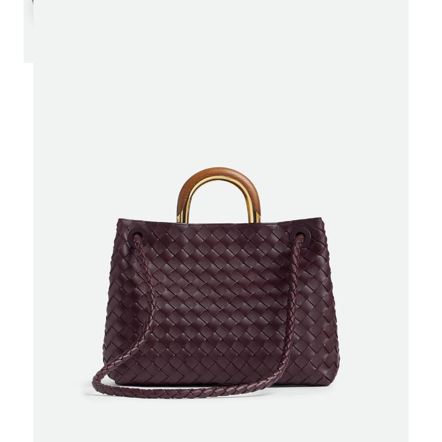 • Intrecciato leather top handle bag with oak and metal top handle and sliding cross-body strap