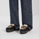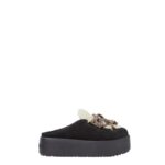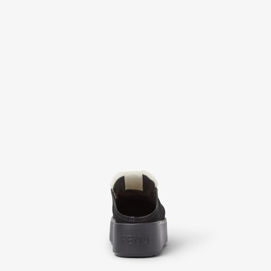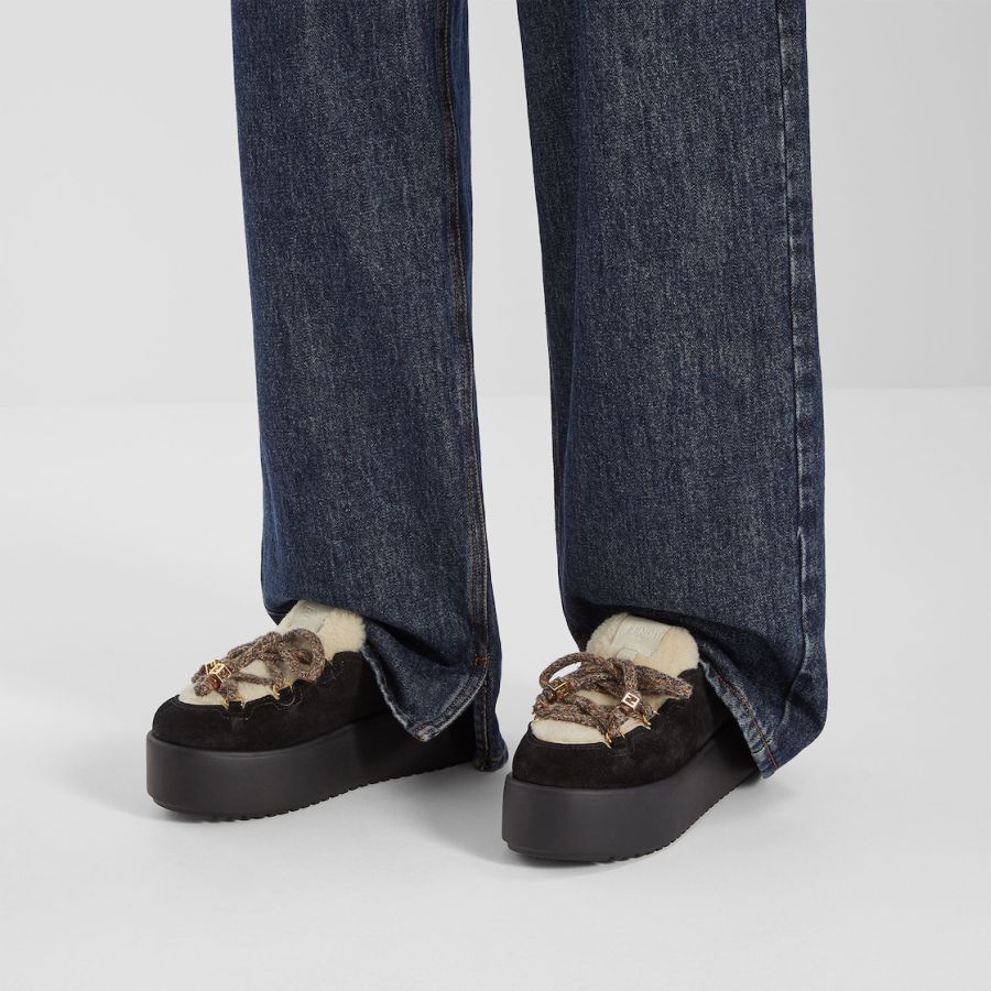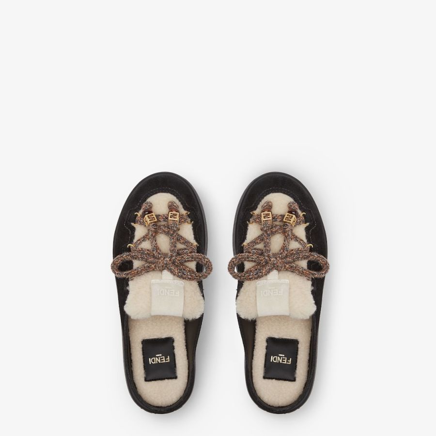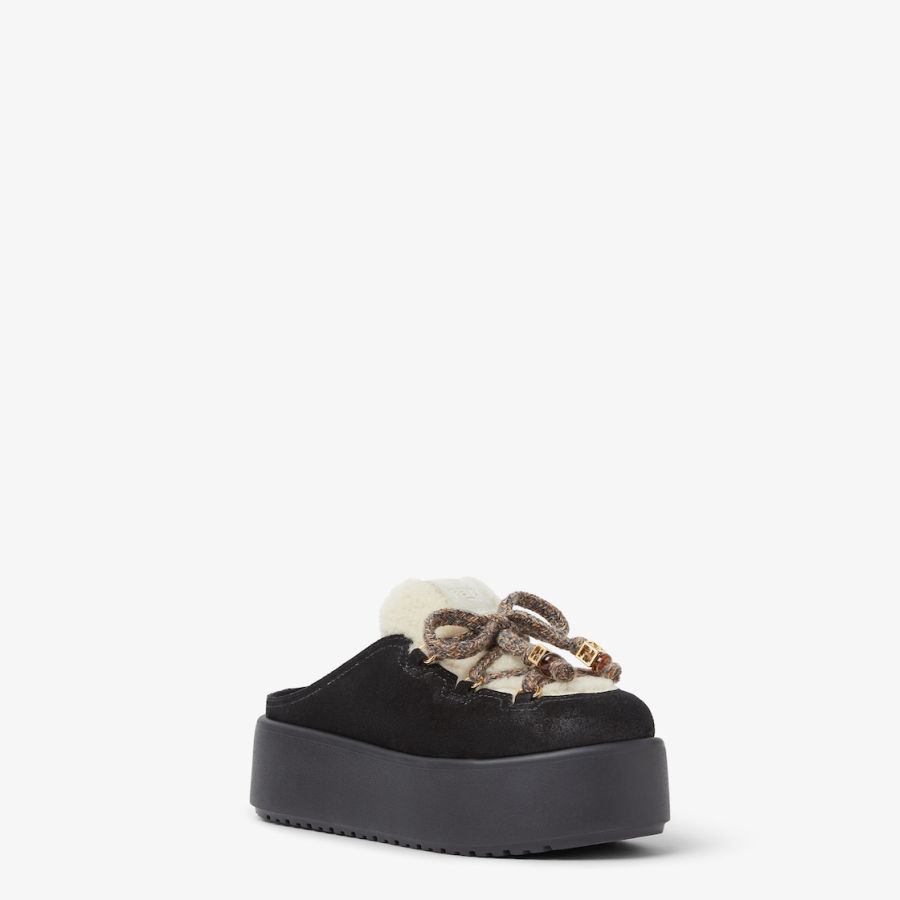 Round-toe après-ski sabots. Made of black suede with vamp and insole in white shearling. Completed by multicolour woven hiking-style laces with rounded resin-effect gold-coloured metal FF beads. Chunky tone-on-tone rubber sole with Fendi lettering on the heel.
