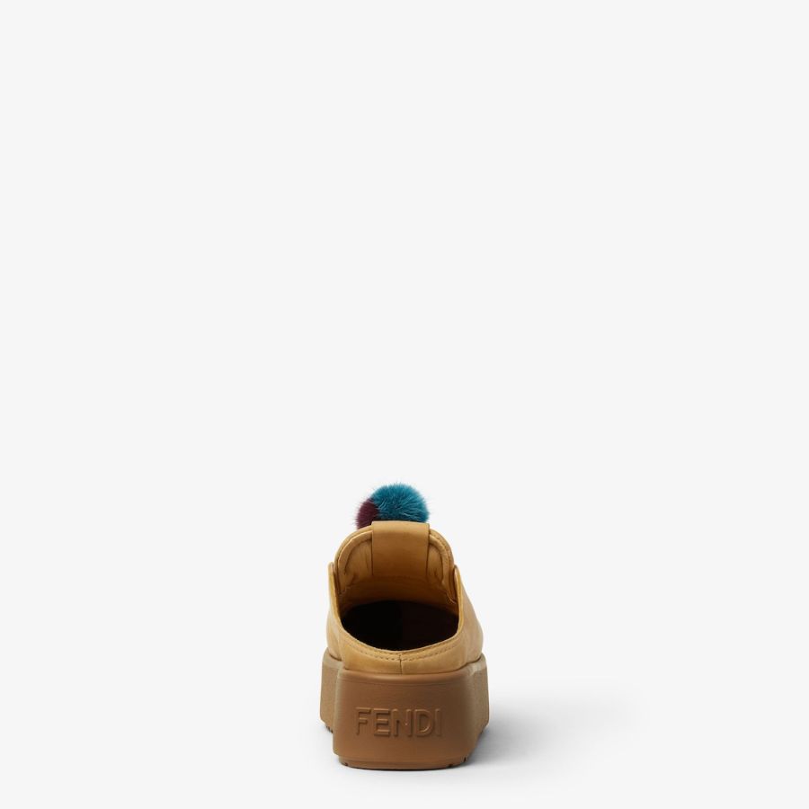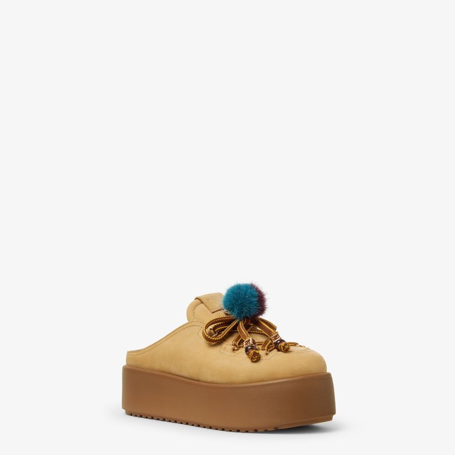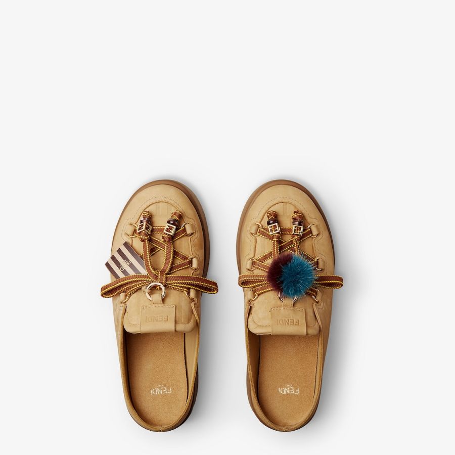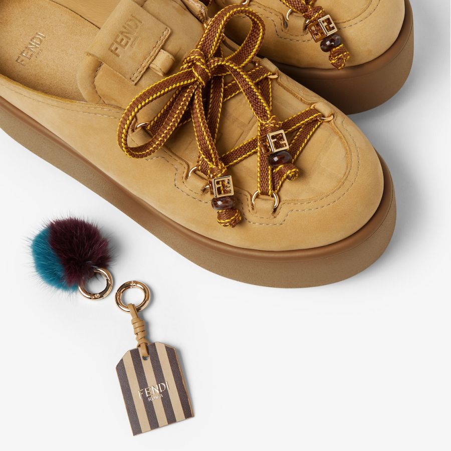 Round-toe après-ski sabots. Made of light brown water-resistant nubuck leather with an embossed tone-on-tone embossed FF motif on the vamp. Completed with charms attached by a metal ring onto the tongue: the right shoe is adorned with a small doll in braided cord with two-tone mink pom-pom gold-colour metal FF motif beads. The left shoe features a two-tone cord bow with a gold-colour metal FF bead and a tag embossed with the Pequin motif and logo. Chunky tone-on-tone rubber sole with Fendi lettering on the heel.