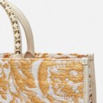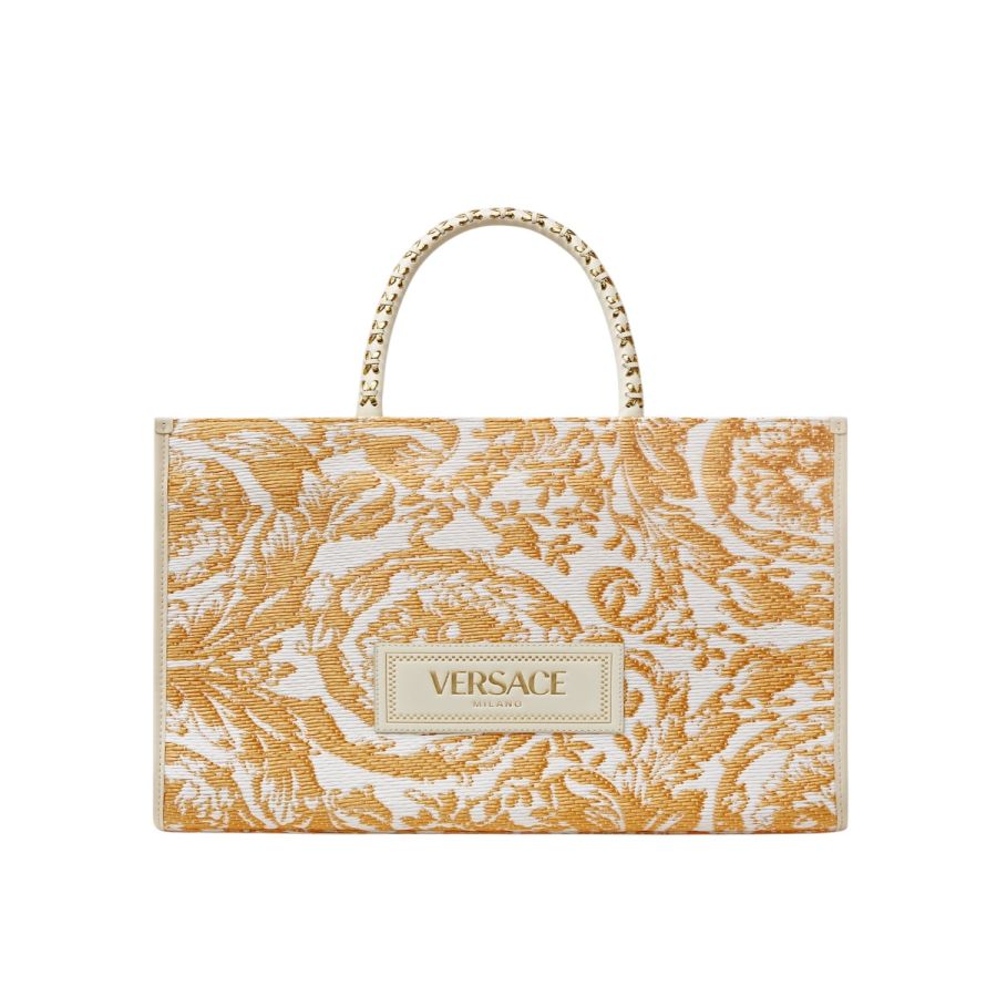 A spacious tote bag woven from raffia in the Barocco pattern featuring a leather Versace ’90s Vintage Logo-embossed tag at the front. The bag is complete with tubular whip-stitched top handles, and has a detachable crossbody strap for multiple carry options.