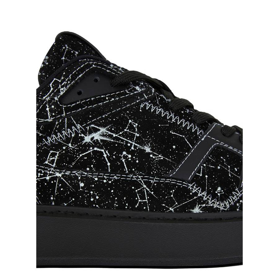 - Multi-material design in printed suede and rubber leather