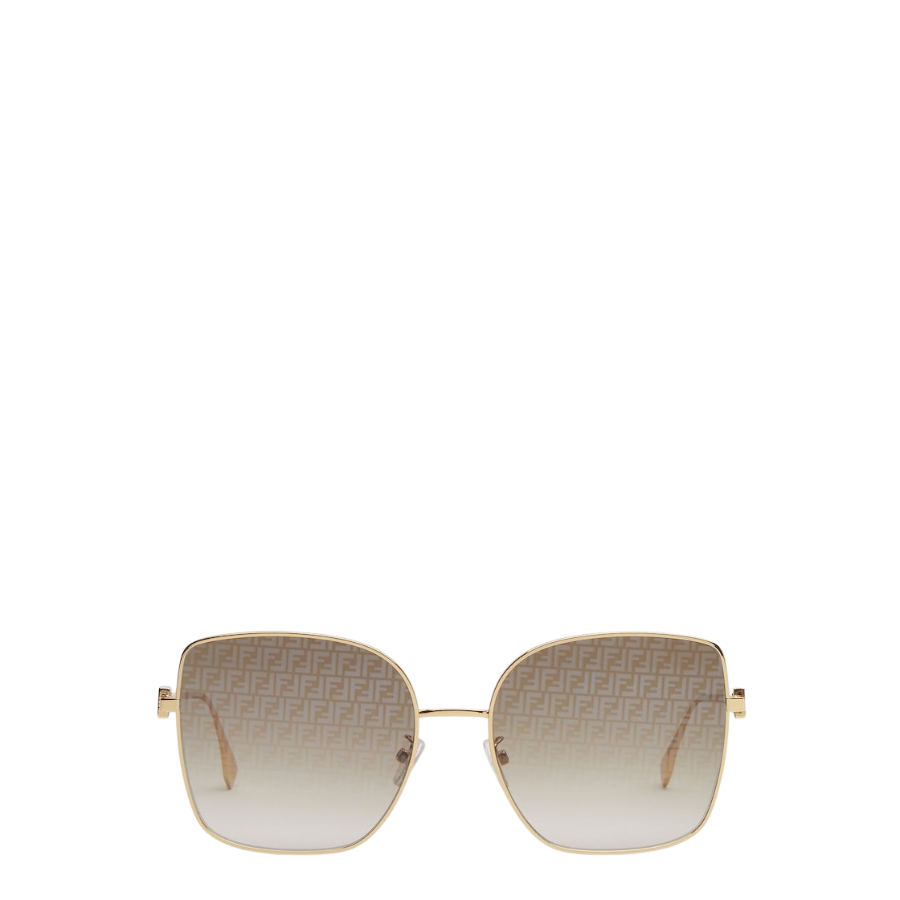 Oversized, square Baguette glasses in gold-coloured metal with Baguette logo on the temples. Khaki gradient lenses with gold-mirrored FF micro logo and adjustable nose pads.