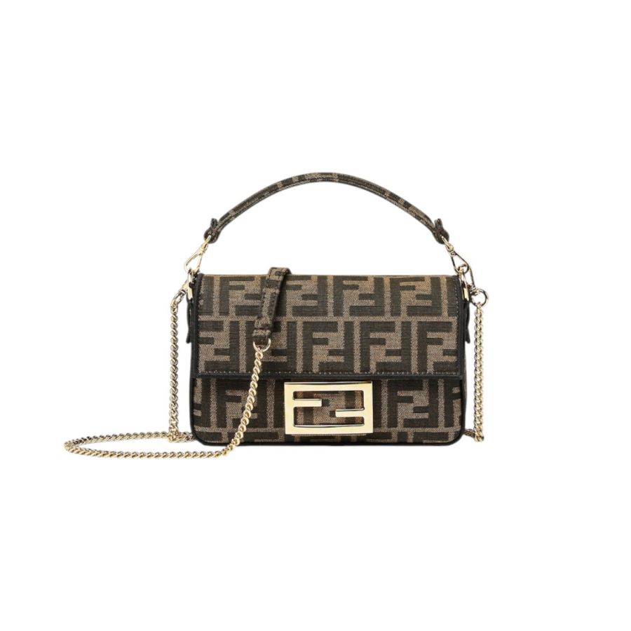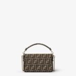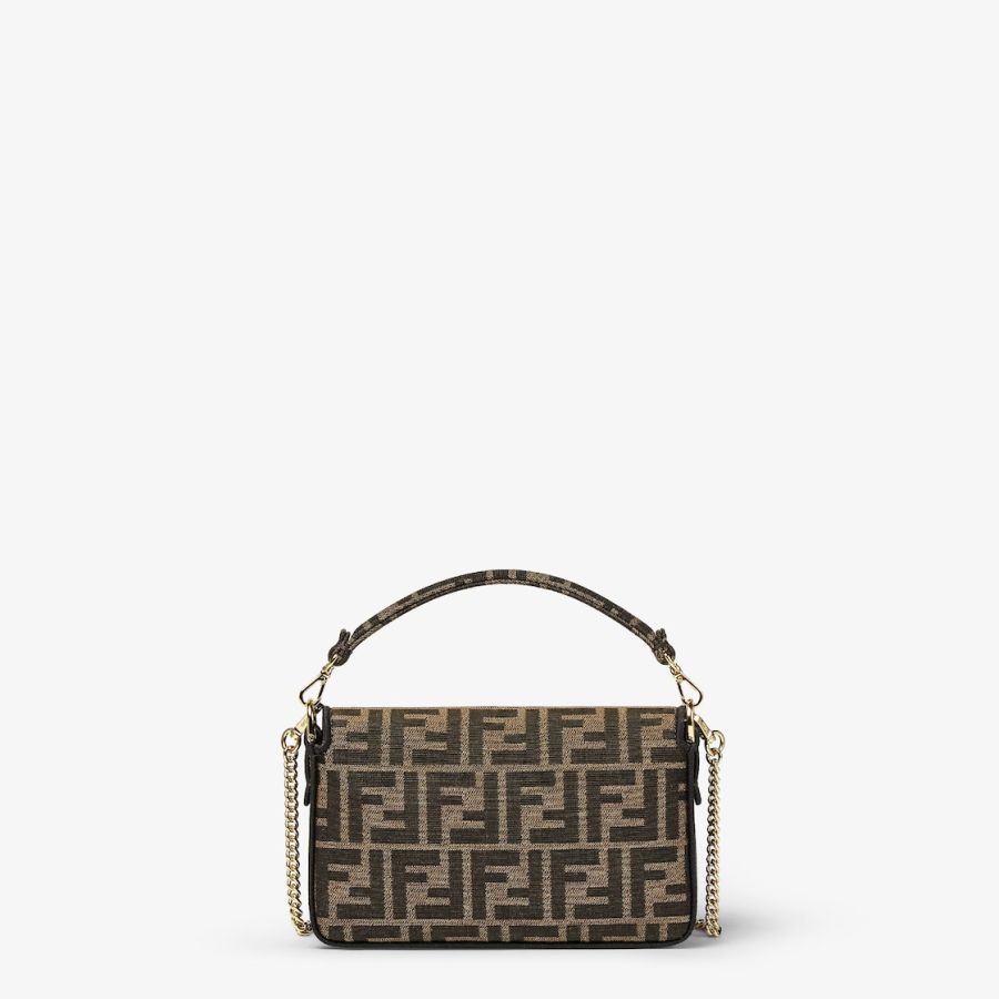 Iconic small Baguette® bag made of jacquard fabric with the iconic FF motif in brown, decorated with an FF clasp and trimmed with black embroidery.