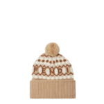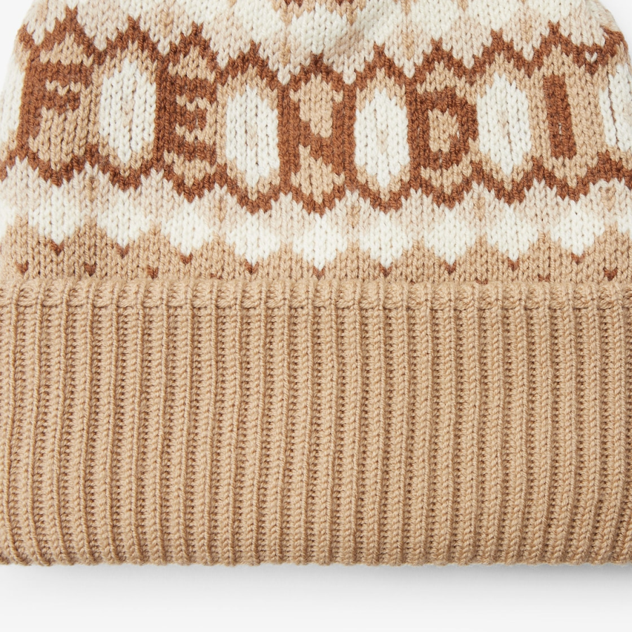 Beanie made of soft wool yarn with an eye-catching Nordic-inspired graphic jacquard motif in brown, beige and camel tones. The pattern alternates geometric elements with details that make up the Fendi lettering. Turned-up brim with plain ribbing in beige tones.