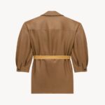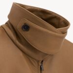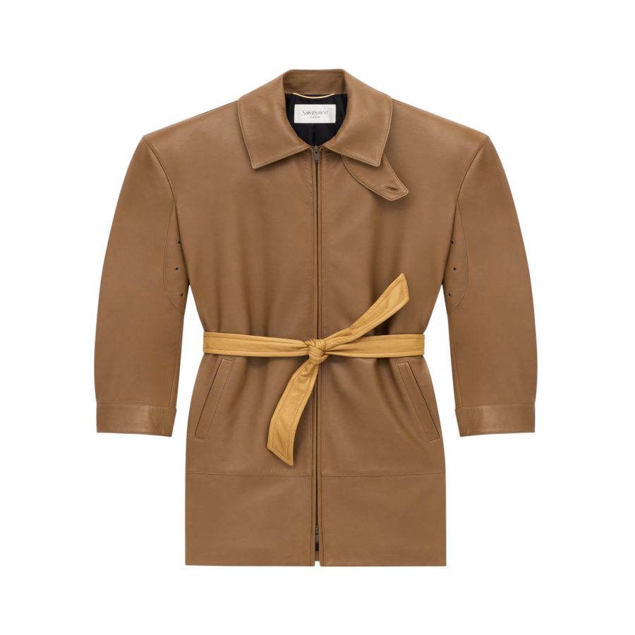 knee-length zip jacket with a two-way pointed and stand colla and a contrasting belt tied at the waist.