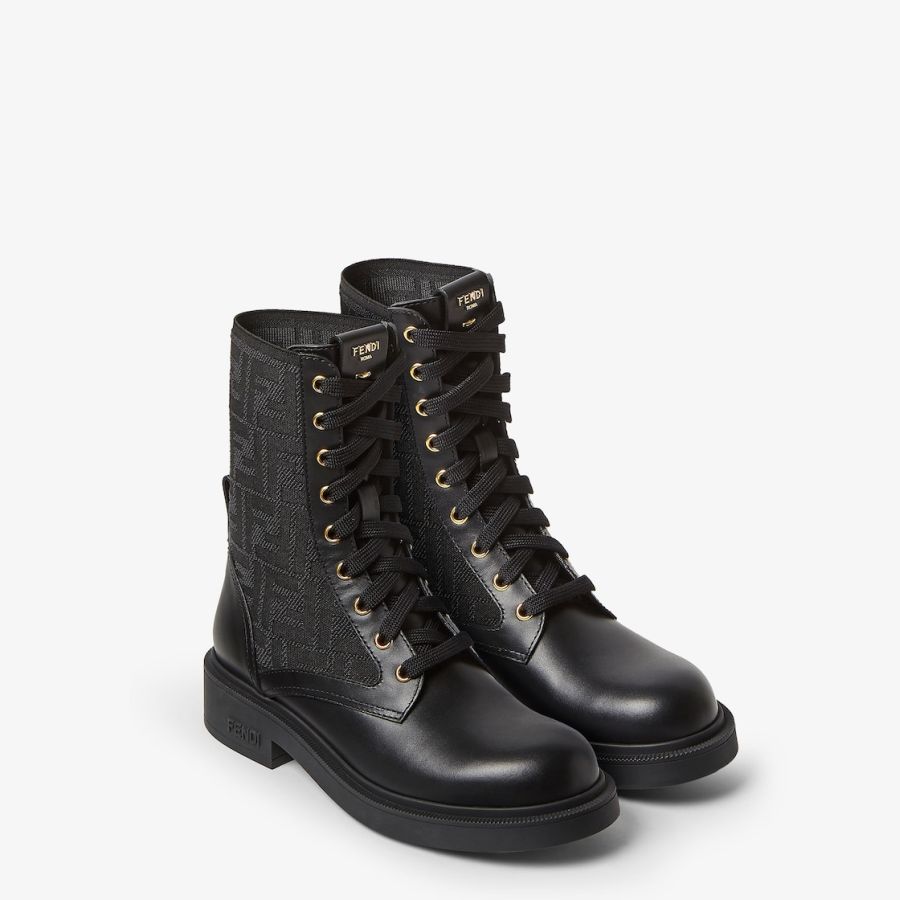 Fendi Filo biker boots with round toe. Made of black leather and stretch fabric with the iconic FF motif in black. Embellished by metal eyelets, Fendi Roma lettering and Selleria Metal Stitch with a gold-colour finish. Rubber sole and heel with Fendi lettering on the side.
