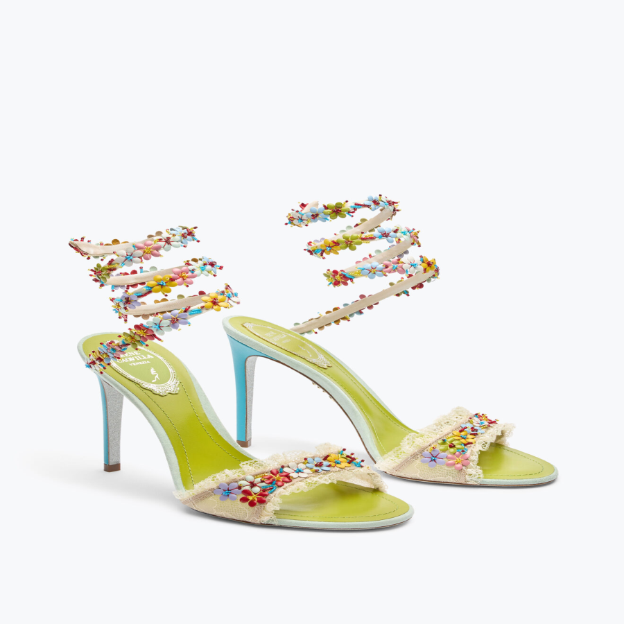 A tribute to the beautiful, color-filled warm season, the archive-inspired Bloom style stands out with hand-embroidered corollas of multicolored flowers adorning the upper and serpent, and finished with a light blue heel and green sole.