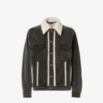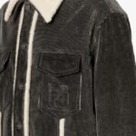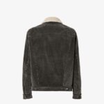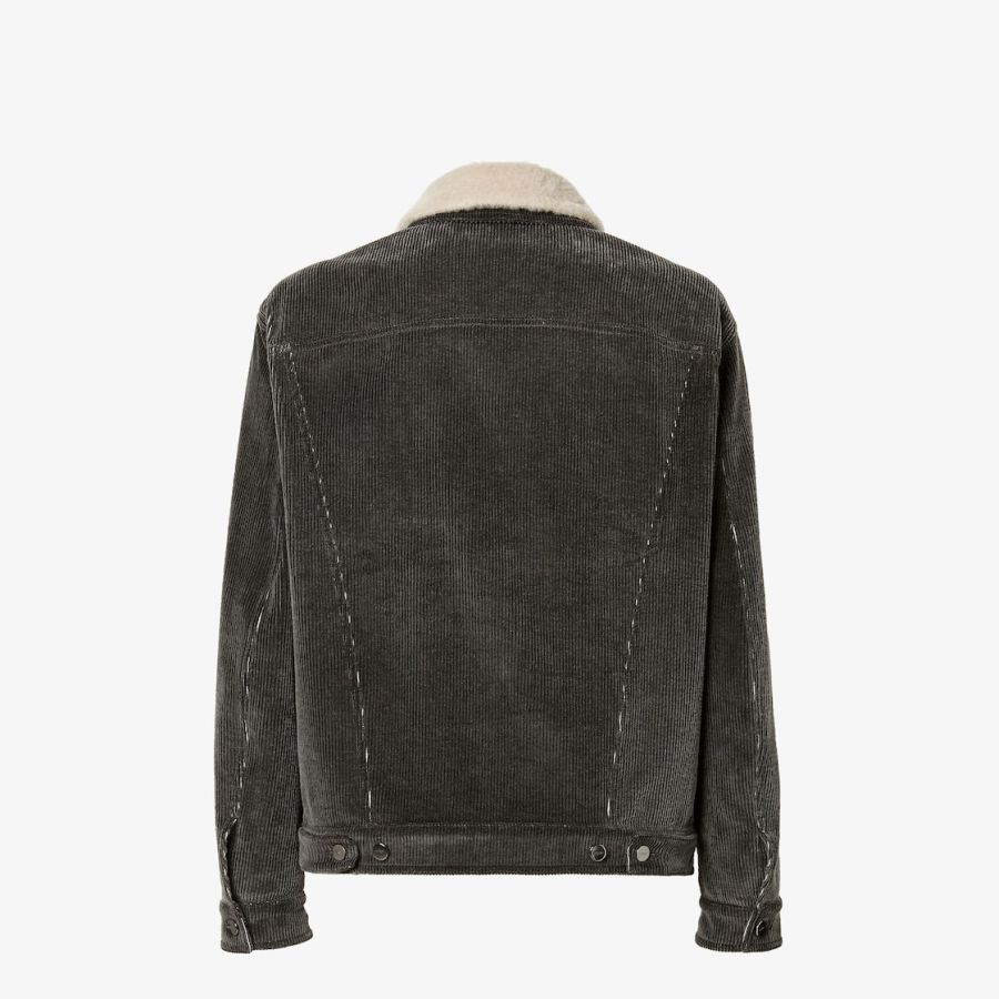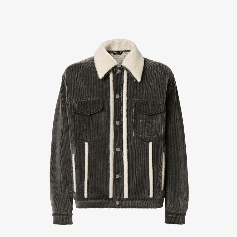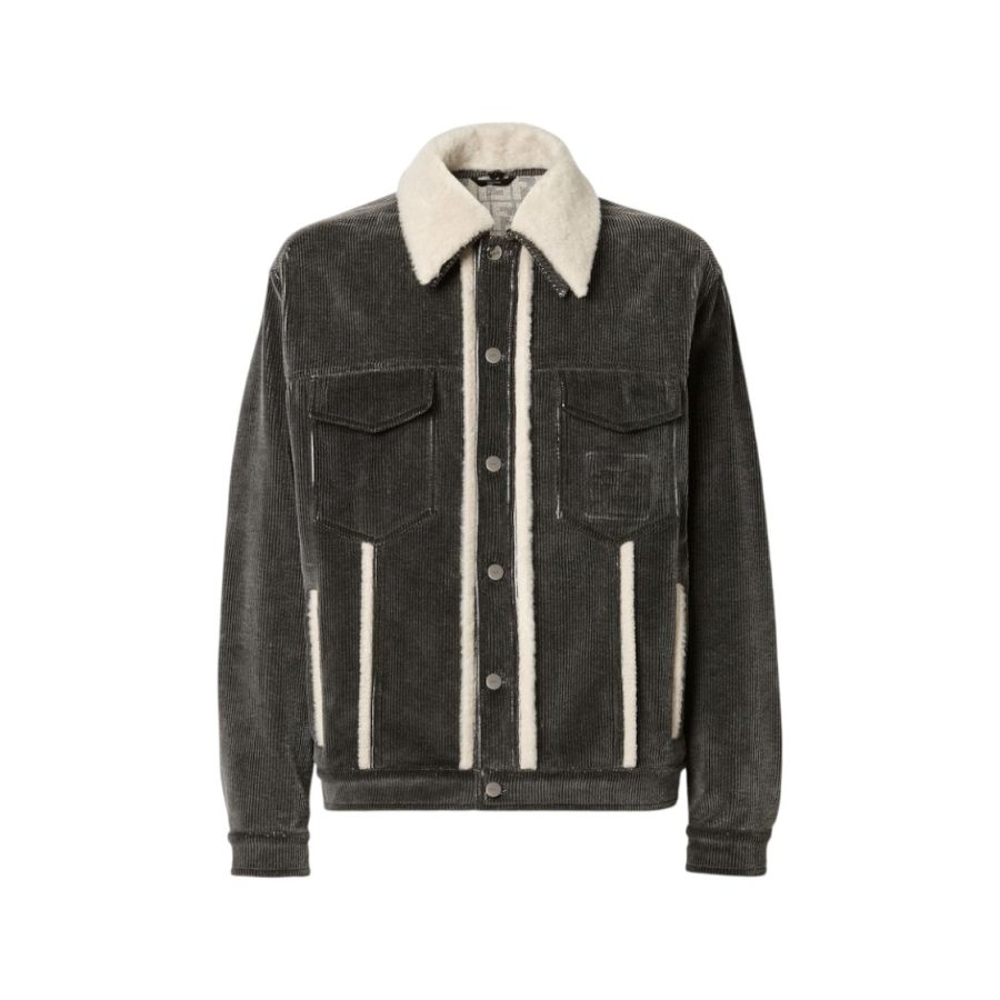 Short blouson with shirt collar and long sleeves. Vertical welt pockets on the side and patch pockets with flap on the chest. Branded tack-button fastening. Made of cotton corduroy with a faded black stonewash treatment and featuring a removable collar and white sheepskin trim. Inside finished with denim FF motif print. Embossed FF detail on the left breast pocket.