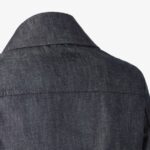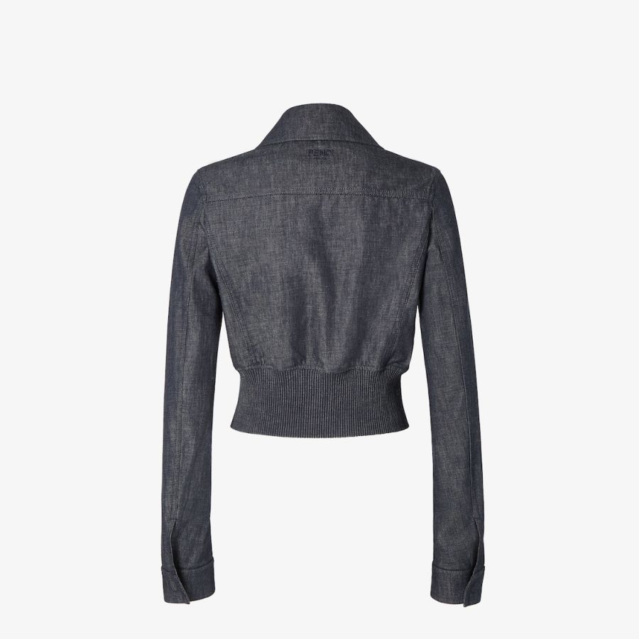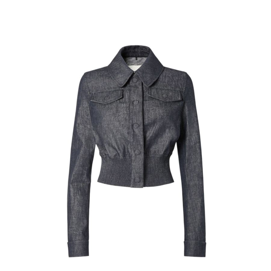 Cropped jacket with shirt collar and wide elasticated waist. Breast patch pockets with flap and press stud. Front closure with concealed press studs. Made of ultra-light denim chambray. Customised with a matching embroidered logo on the left sleeve.