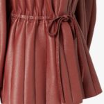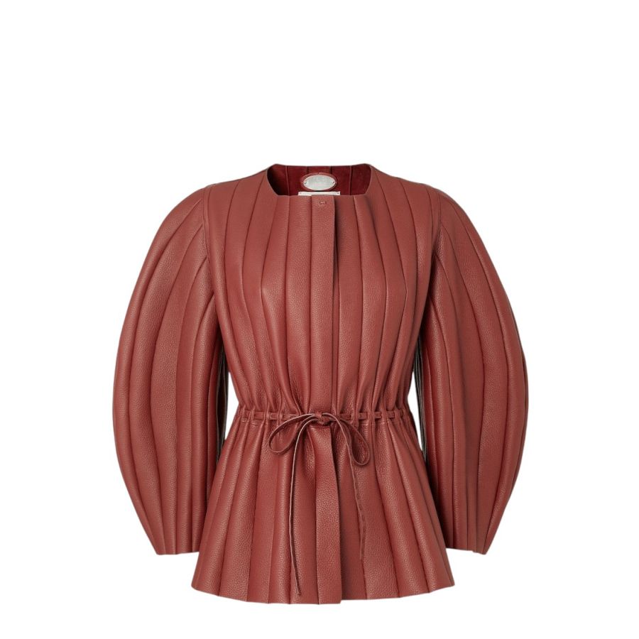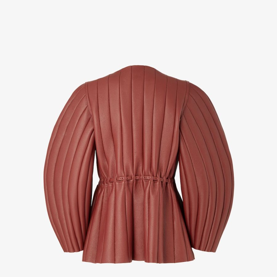Jacket with long cocoon sleeves and crew neckline. Unlined. Made of rust-coloured deerskin with workmanship inspired by the iconic Pequin motif. The vertical panel construction with visible stitching recreates the typical accordion pleated effect. Selleria silver plaque and drawstring waist finished with macro hand-sewn stitching, an emblem of the iconic Selleria stitching handed down through generations of Fendi artisans since 1925.