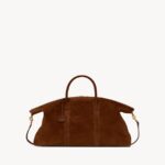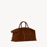 oversized Saint Laurent Paris embossed zip bowling bag with tubular leather top handles and an adjustable, detachable crossbody strap.