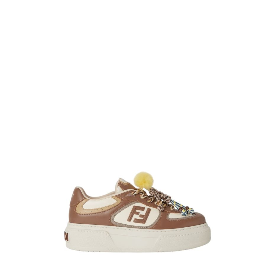 Fendi Match lace-up trainers. Made of brown leather with beige and white details. FF appliqué on the sides in contrasting leather and hiking laces in white, beige and brown. Rubber platform sole with oversized, embossed Fendi lettering at the back. Finished with charms attached by a metal ring on the tongue: on the right shoe is a little doll in braided cord with contrasting mink details and gold-coloured metal FF bracelets. On the left shoe is a braided cord scoubidou with contrasting mink double pom-pom, completed by a metal FF bead, and tag with printed Pequin motif and logo.