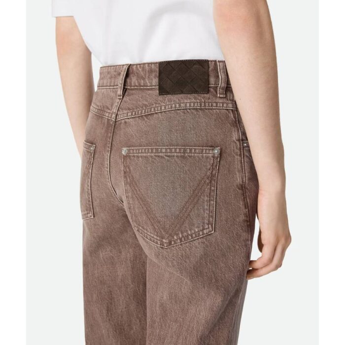 Jeans with straight leg in brown washed denim with Intrecciato suede back patch.