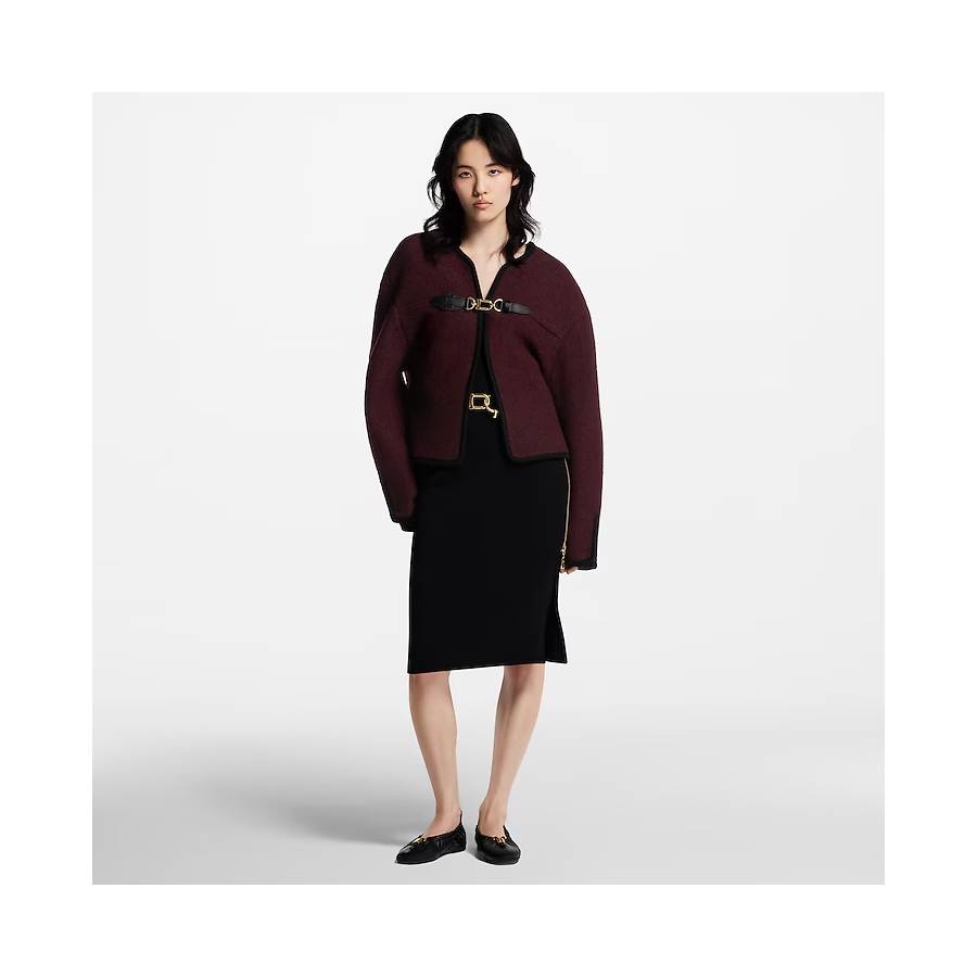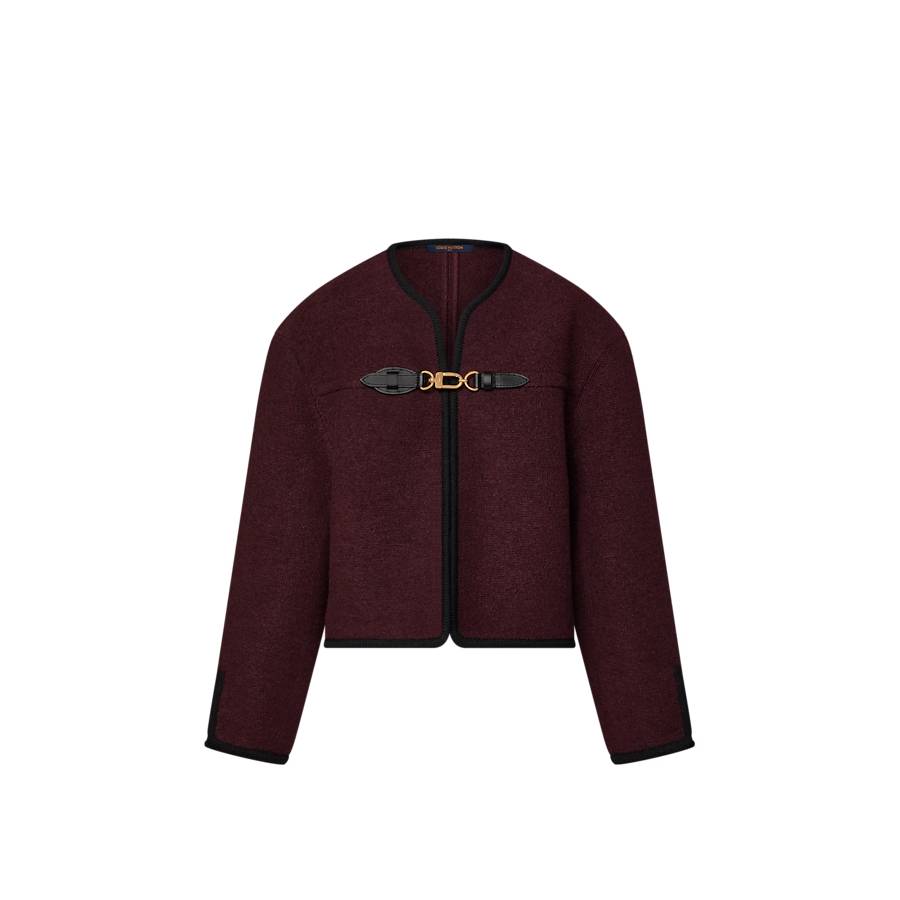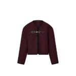 This jacket is timelessly elegant in plush wool bouclette in a rich seasonal shade finished with graphic black piping. It is cut in a versatile boxy shape with a clean neckline, while the front is fastened with the House’s signature carabiner buckle trimmed with leather details for a sleek, modern touch.