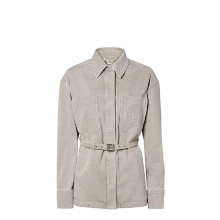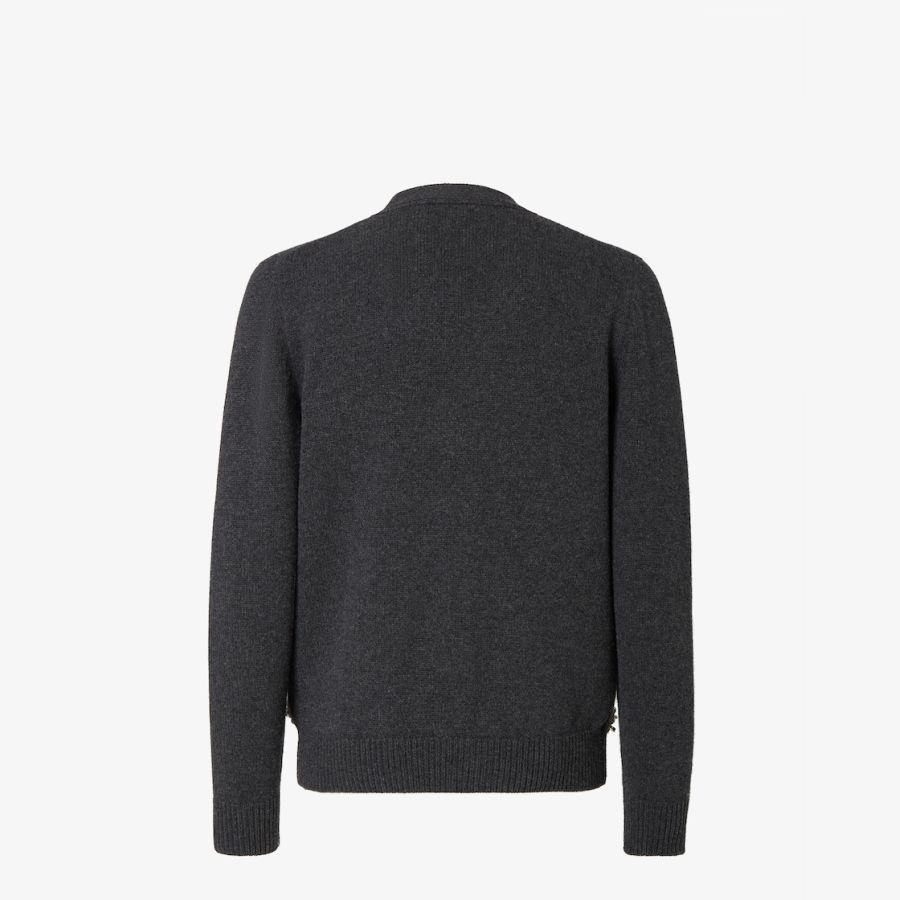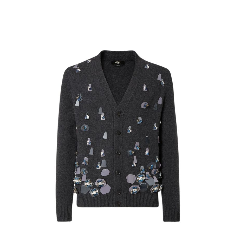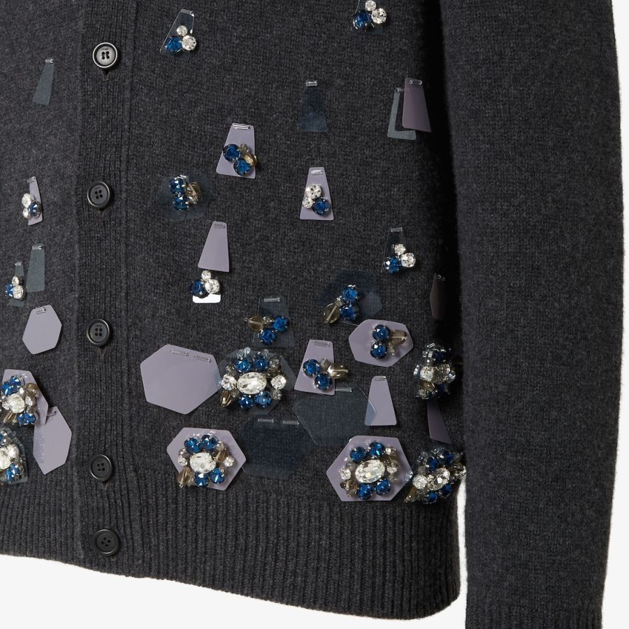 V-neck cardigan fastened with matching buttons. Borders embellished with ribbing. Made of dark grey wool yarn and embellished with hand-sewn embroidery with oversized, geometric shaped fringing. The addition of set stones creates a three-dimensional effect and a play on light.