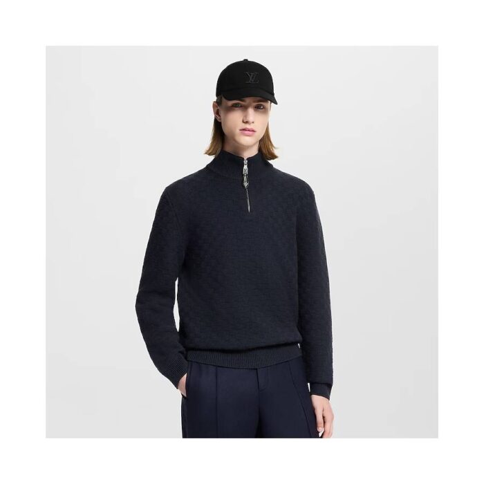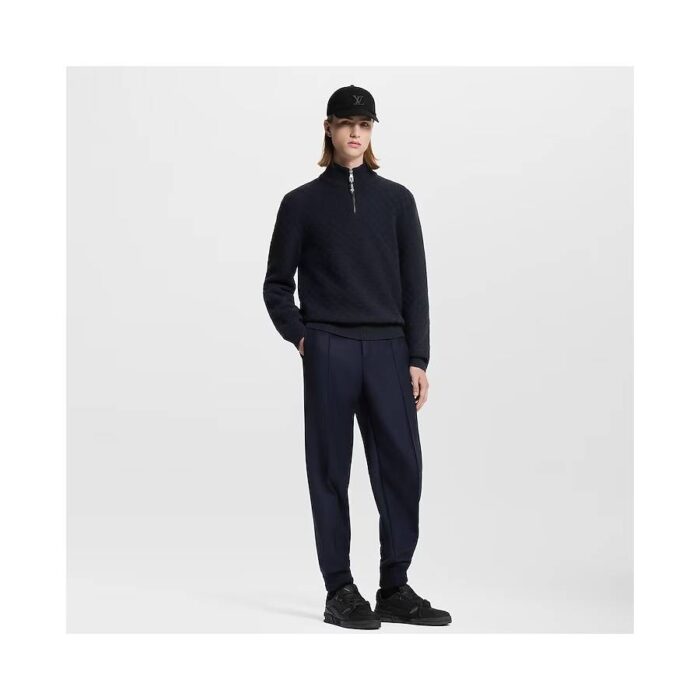 Crafted in a fine cashmere-wool blend, this navy blue half-zip pullover brings a relaxed note to a formal ensemble. An allover tone-on-tone Damier motif elevates the textured knit while a leather Marque L.Vuitton Déposée label embellishes the back. A leather puller on the zipper featuring a Monogram Flower detail adds a distinguished finishing touch.