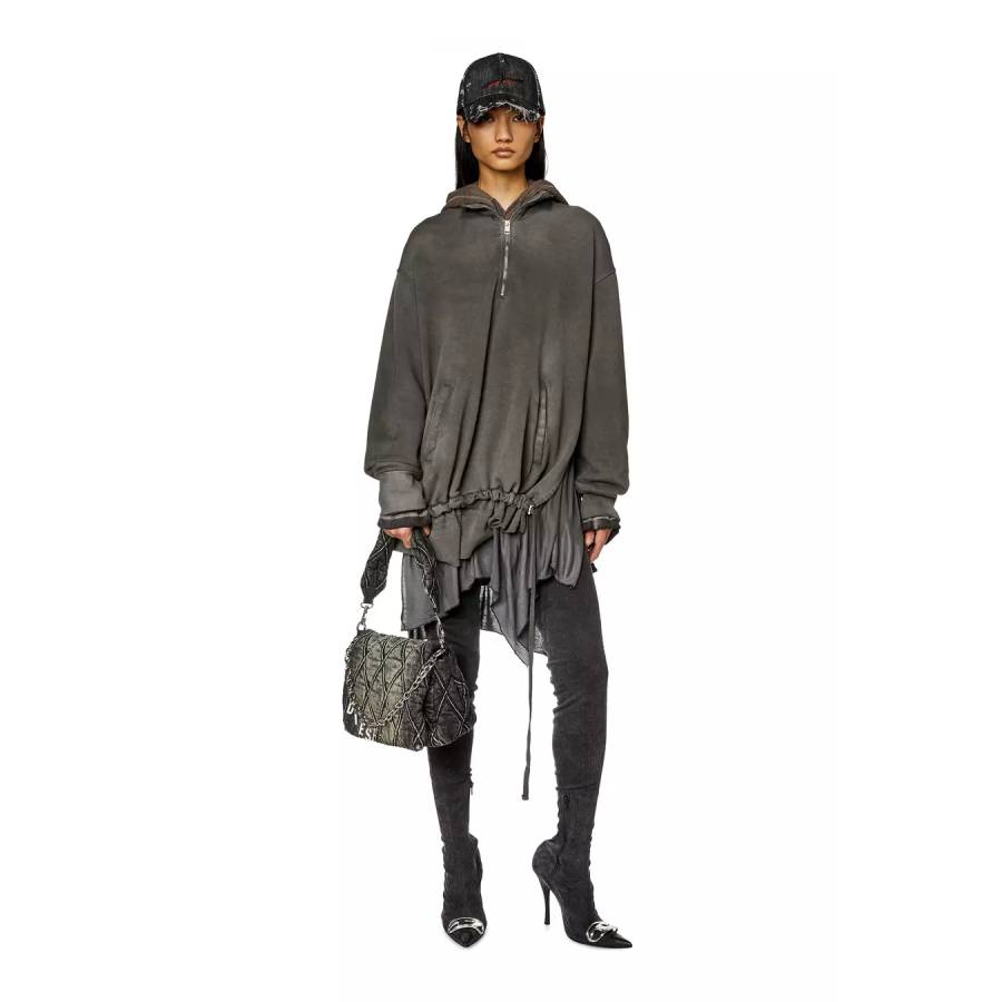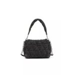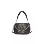This womens handbag is made from quilted black denim with a treated finish. The front flap opens up to a single compartment with an internal zipped pocket. The bag features a soft denim handle and a longer denim and chain strap in matte silver-tone metal, adorned with rhinestone Diesel letter charms that can be draped across the front. The chain also doubles as a bracelet.
