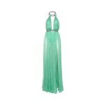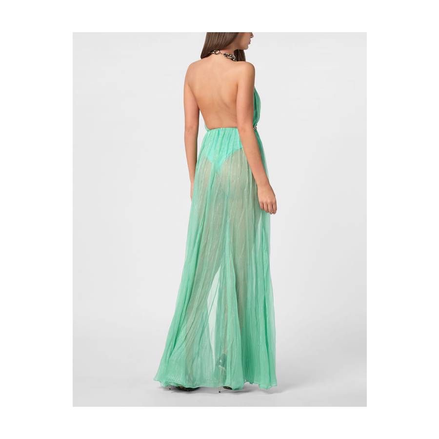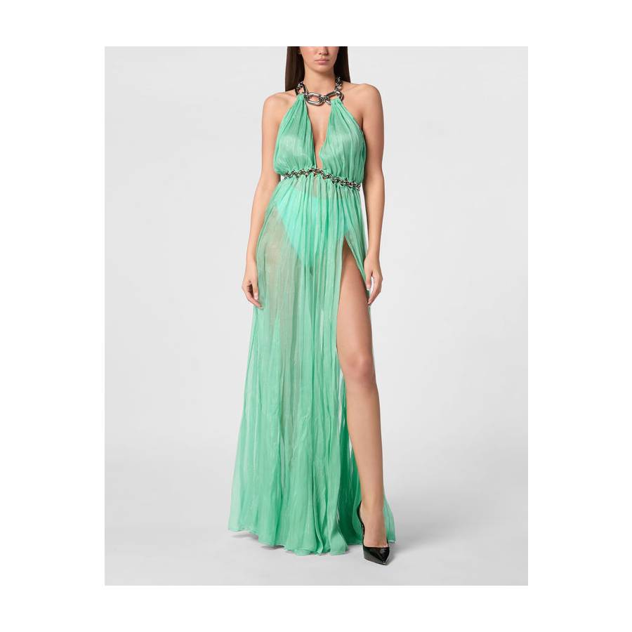 This show-stopping long dress brings ethereal elegance to life with its fluid silhouette and daring neckline, anchored by a bold metal chain detail. A perfect statement for evening glamour or destination celebrations.
