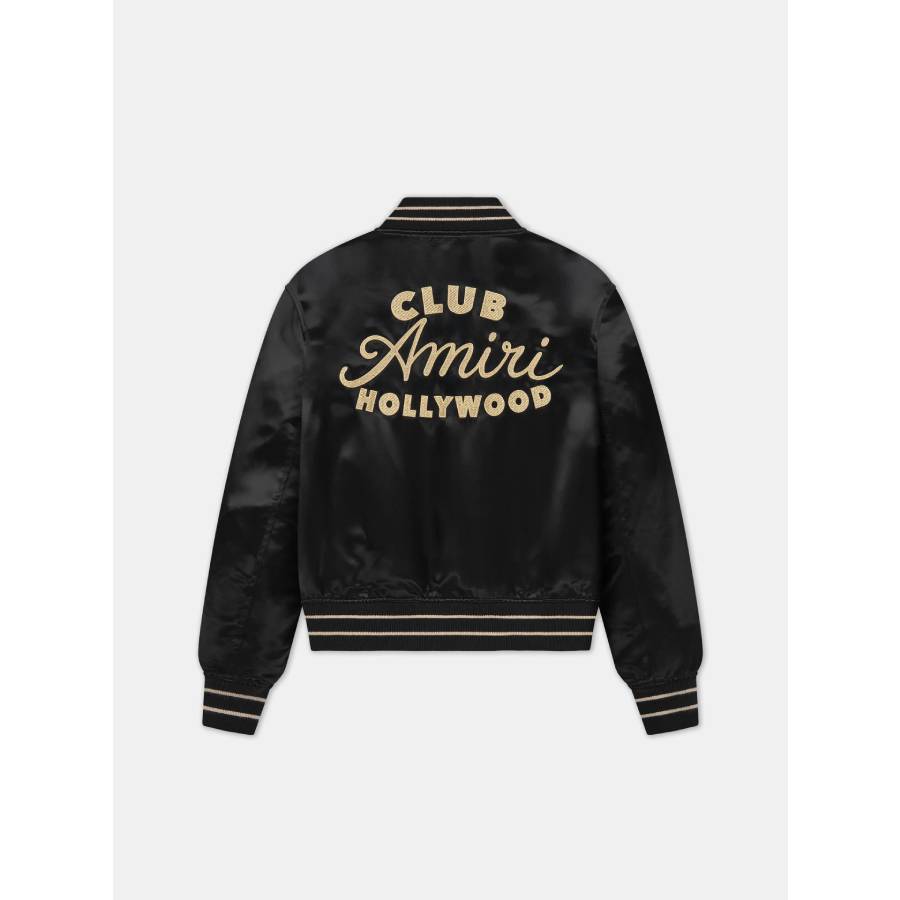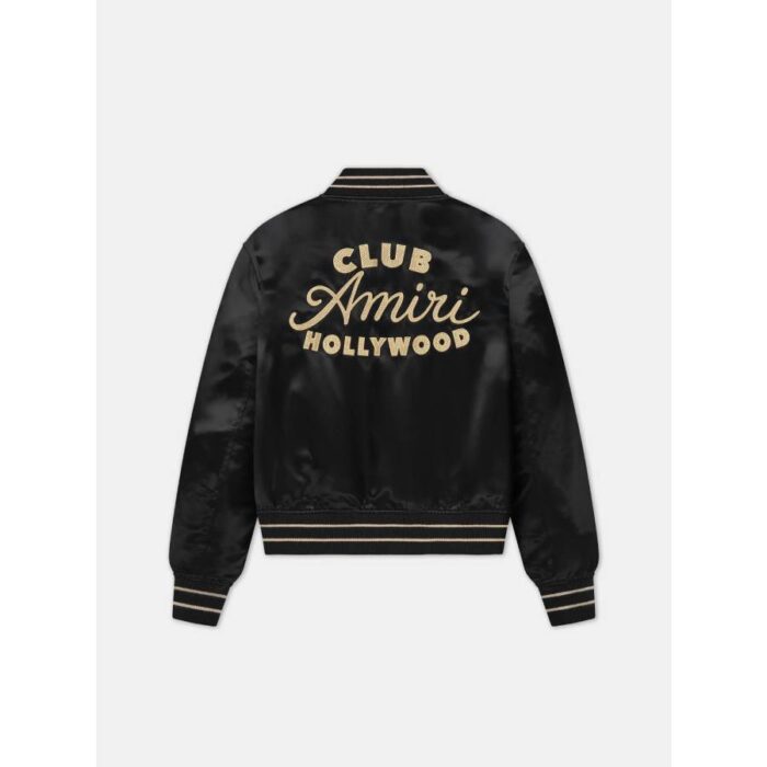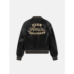 For Autumn-Winter 2025, the spirit of Los Angeles remains at the heart of AMIRI, with graphics that idealize a fictional Hollywood venue. The Club AMIRI Satin Jacket is crafted with seasonal logo embroidery, banded rib finishes, welt zipper pockets, and double-zip closure featuring the MA icon.
