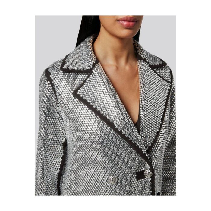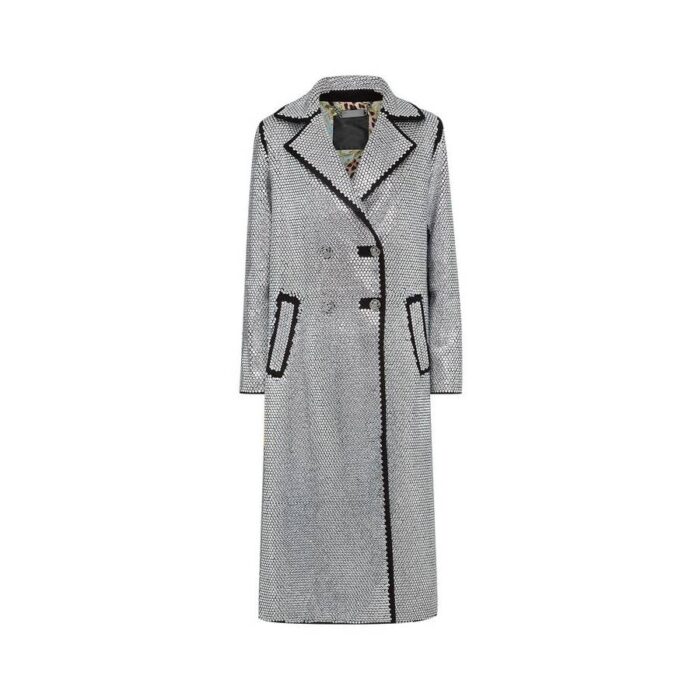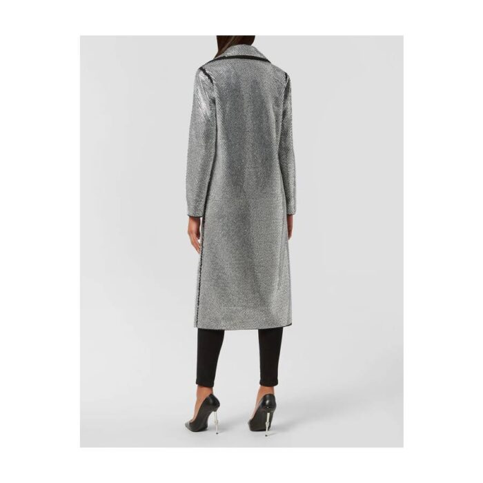 Find the Diva within with this rhinestone-encrusted woollen long overcoat. Jewel buttons. Two welt pockets. Printed fabric lining.