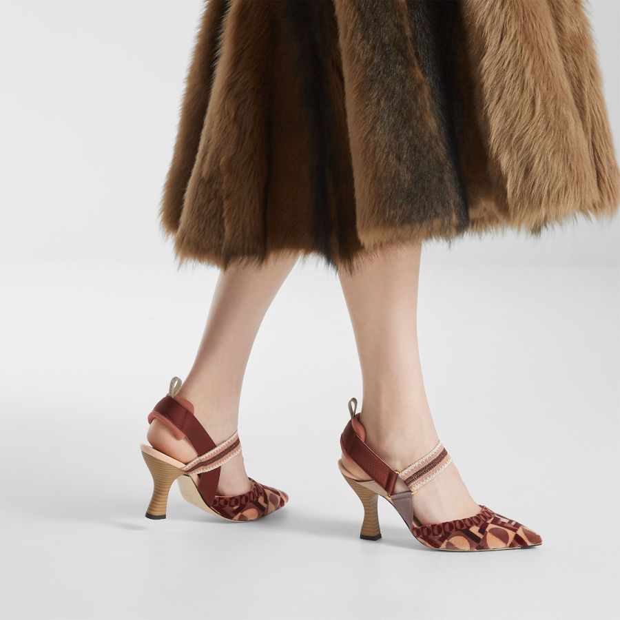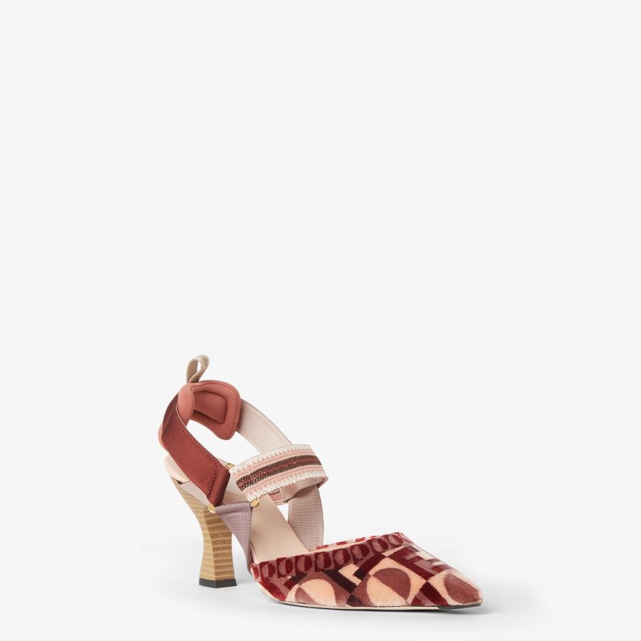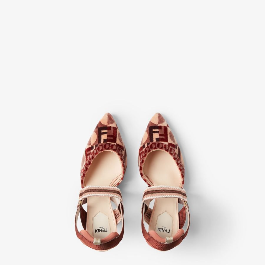 Streamlined and feminine Colibrì slingbacks with elasticated straps that wrap around the foot. The sole is embellished with rubber inserts. Made of a fine tapestry-effect fabric with a Fendi Dots motif, a combination of the iconic FF and Art Deco-inspired polka dots in different shades of pink. The padded cushion and hiking shoe tab add a sporty touch. Heel covered in natural leather.