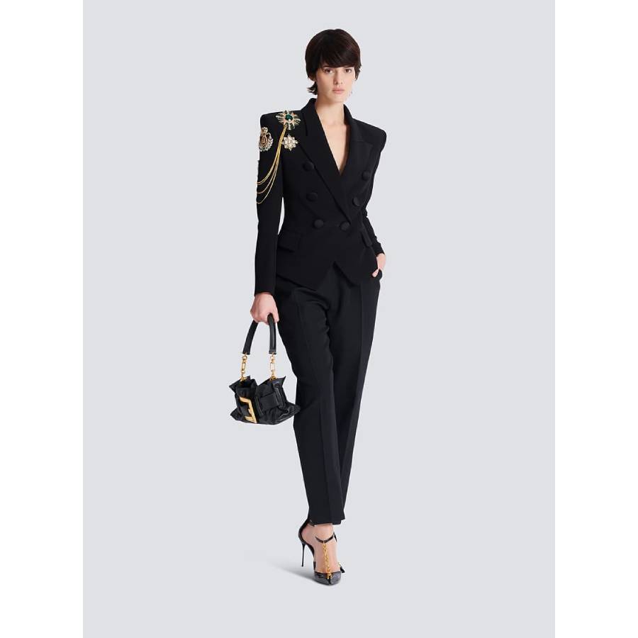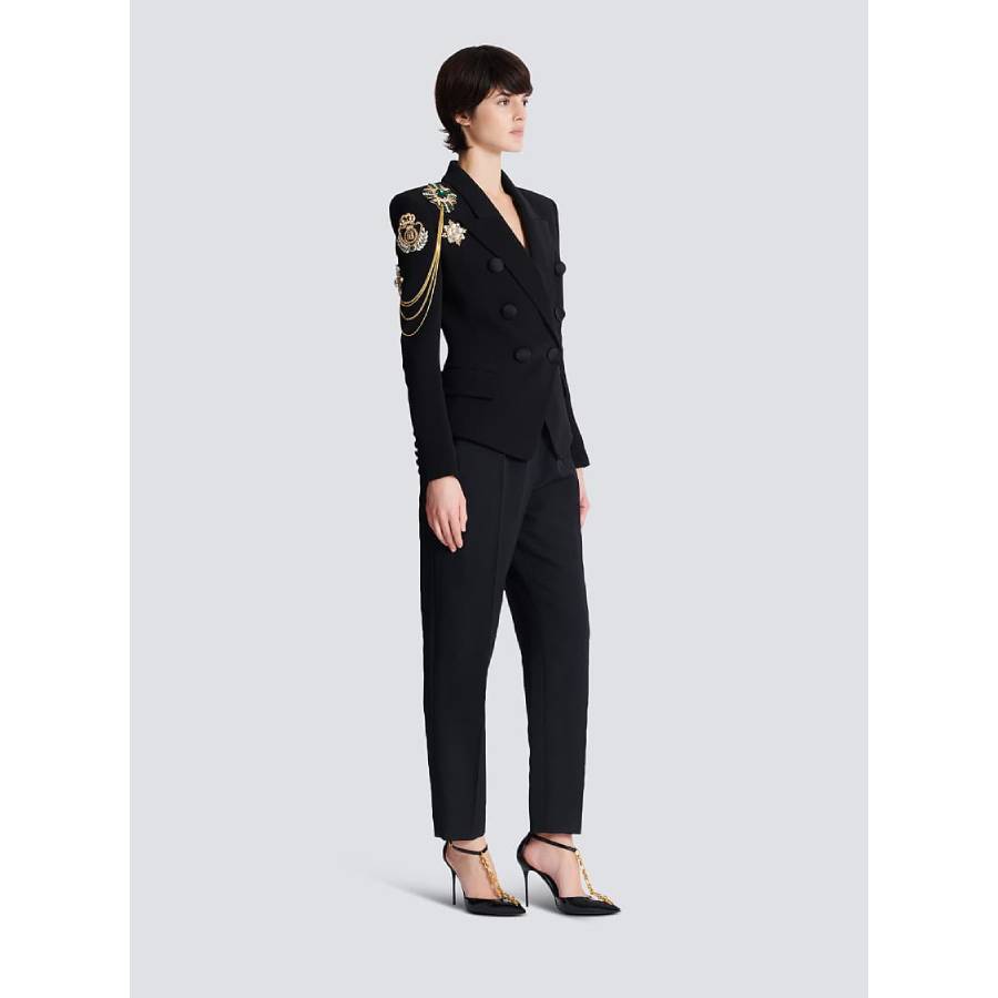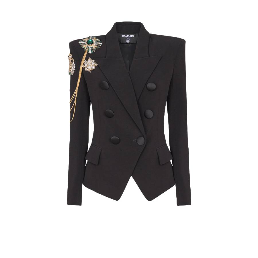 - Embroidered patches on the shoulders and golden metal chains