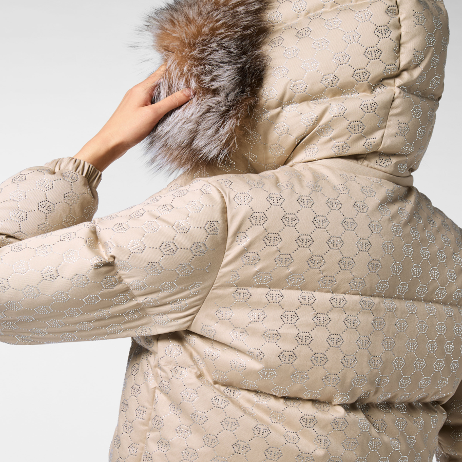 We were able to combine sports and glam style into one garment with a strong personality. Check out this padded cotton down hoodie jacket with defining details.