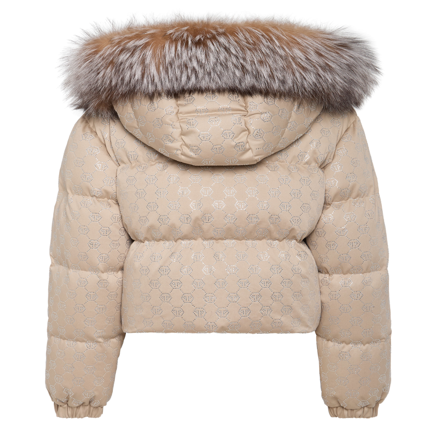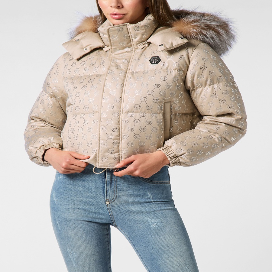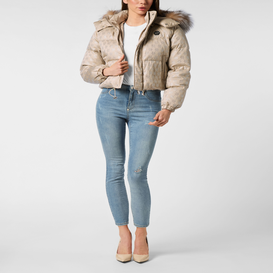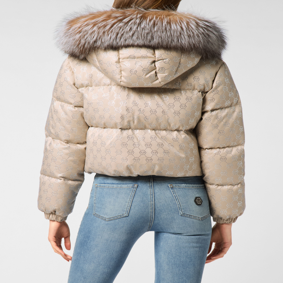 Cropped Down Jacket with Fur Collar Monogram Strass