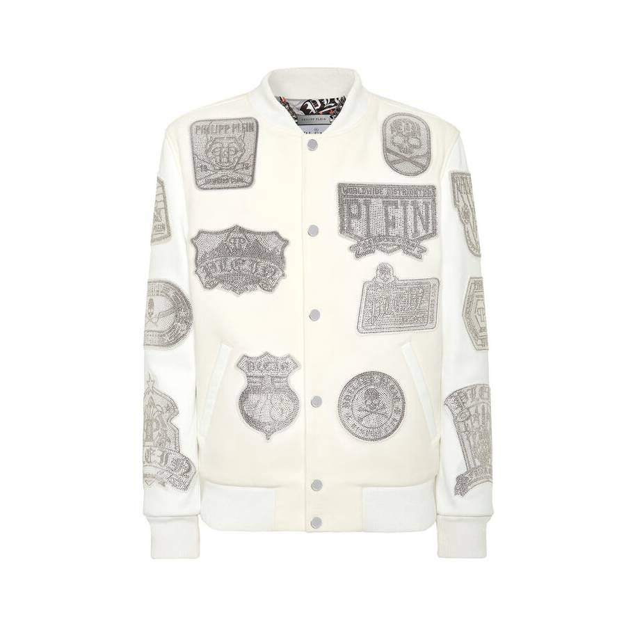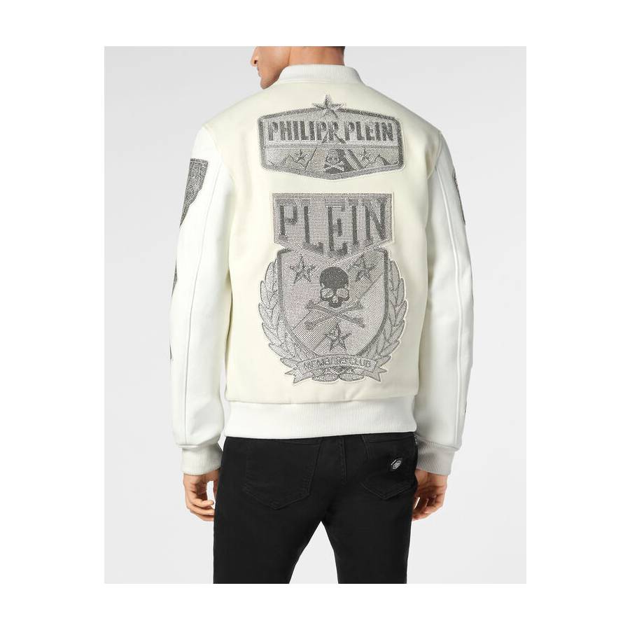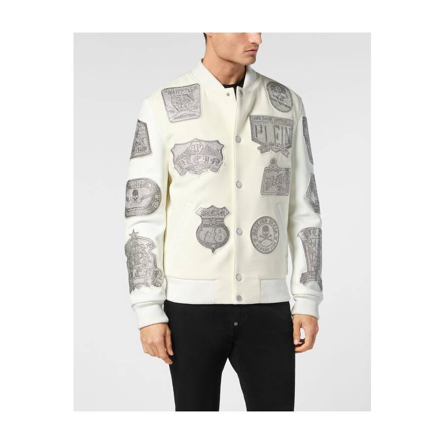 Home Men Clothes Jackets & Sweatshirts Crystal College Bomber With Leather Sleeves Patches