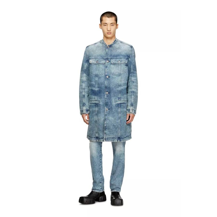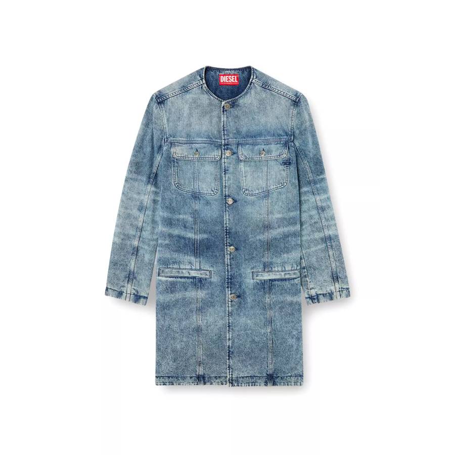 Men’s collarless coat from the Fall Winter 2025 Runway. An elevated interpretation of a trucker silhouette, this longline jacket features branded rivet buttons, classic jeans stitching, and a tonal D embroidered on the chest.