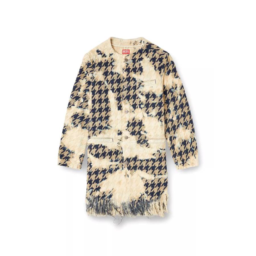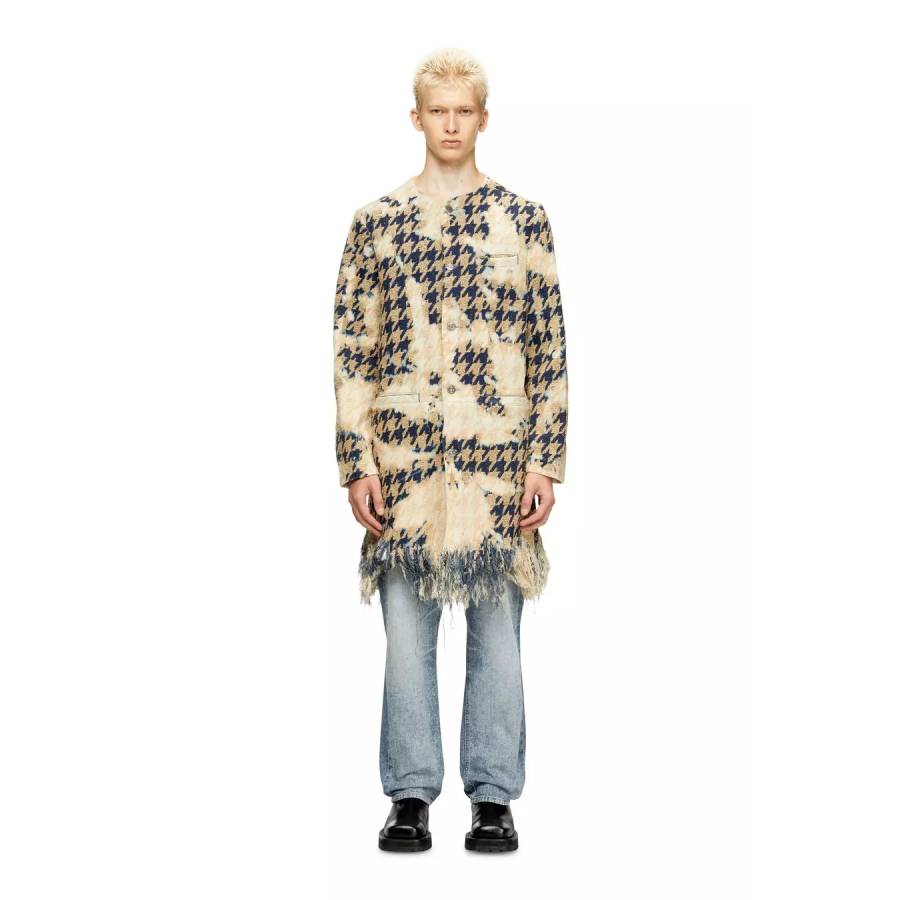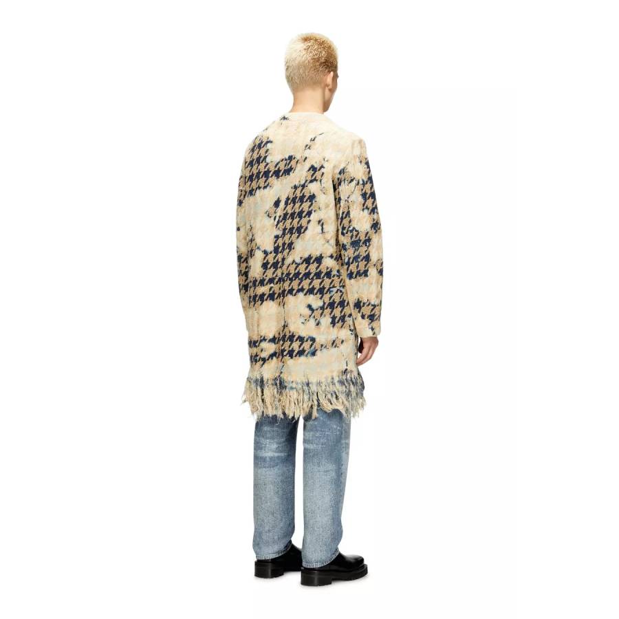 This Fall Winter 25 Runway coat is cut to a straight, collarless silhouette that combines simple lines and extreme destroyed detailing. The fix denim is lasered to create bold light and dark contrasts that trace an all-over houndstooth pattern. The worn-in texture and floating threads are made using innovative treatments and burn effects, and finished with heavily frayed hems. As a result, each piece is one-of-a-kind.