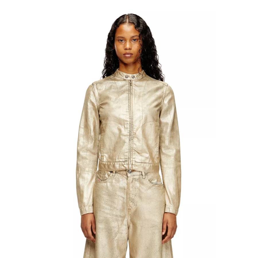 From the Diesel X Karol G capsule — a nine-piece collection echoing the spirit of Tropicoqueta, the Colombian superstar’s latest hit album — this women’s biker jacket sets utilitarian denim against high-voltage shine, sparking fearless character. Grey cotton-TENCEL™ denim is overdyed in sandy tones, coated with shimmery gold Mylar foil, and lasered for a distressed finish. The slightly cropped silhouette inspired by racer styles features a slim snap-fastening collar and two-way zip closure. A silver print on the back completes this exclusive look.