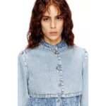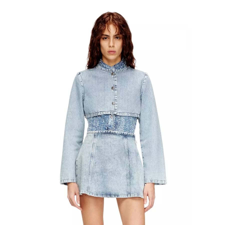Showcasing an extra-short silhouette, this womens cropped jacket features long sleeves, a crew neck, and three branded metal buttons.