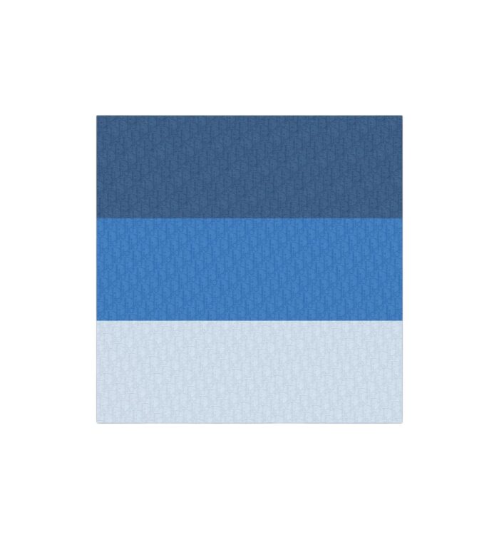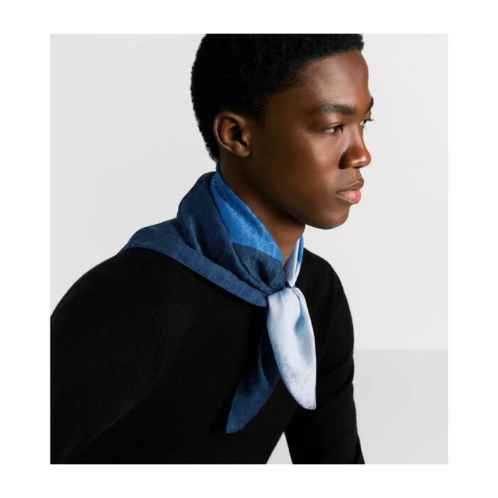 The bandana highlights the iconic Dior Oblique motif in a tonal blue color block version. Crafted in cotton and silk, the bandana can be worn tied around the neck or attached to a bag.