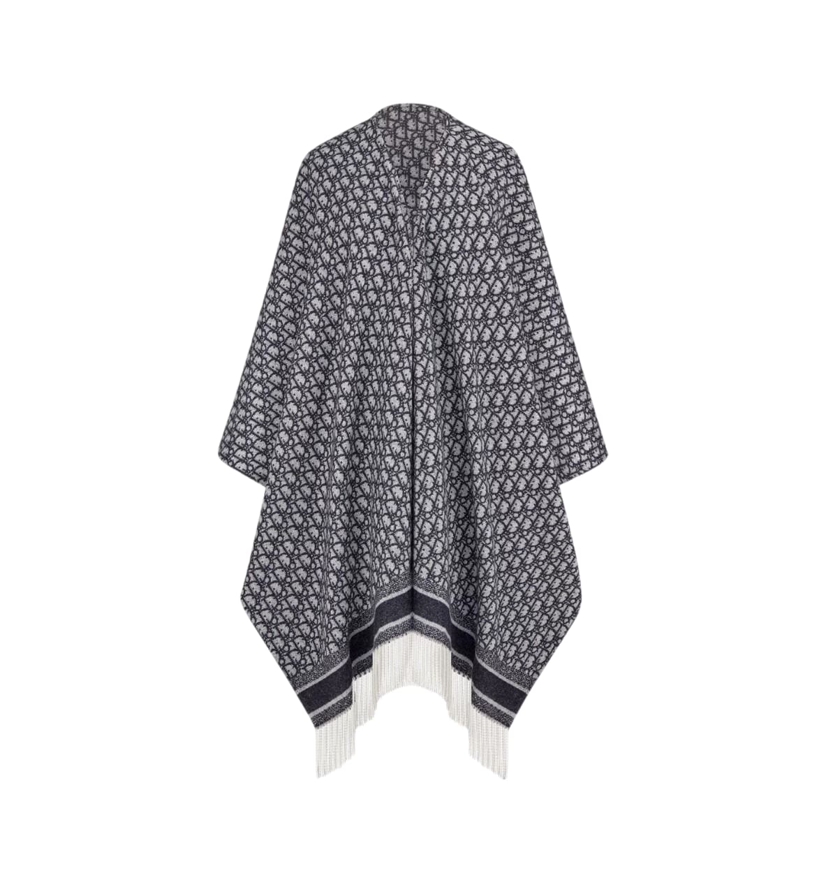 The Dior Oblique poncho showcases the House’s iconic motif in a modern, timeless version. Crafted in navy blue cashmere, the design features fringed edges and tonal Christian Dior signature jacquard bands. Soft and lightweight, the poncho may be worn over the shoulders to lend the finishing touch to any modern look.