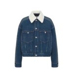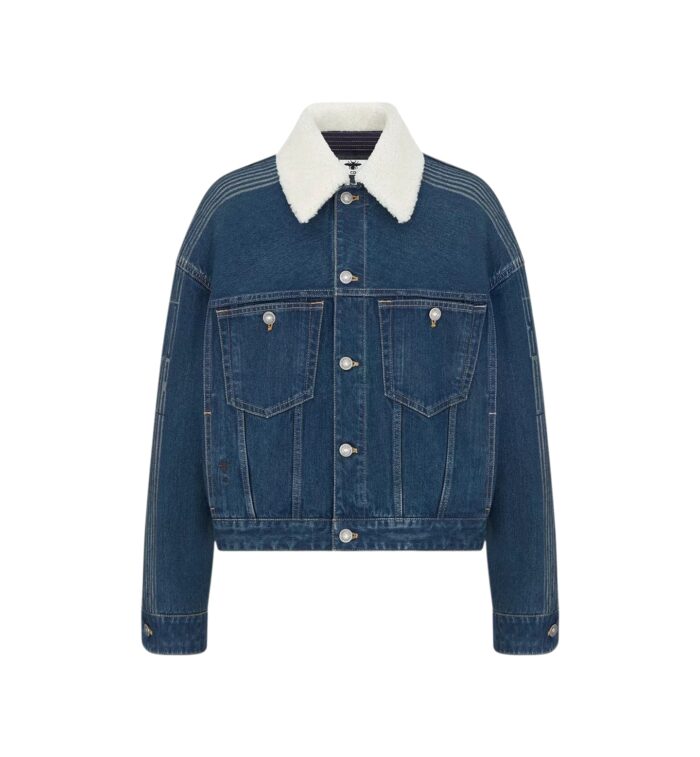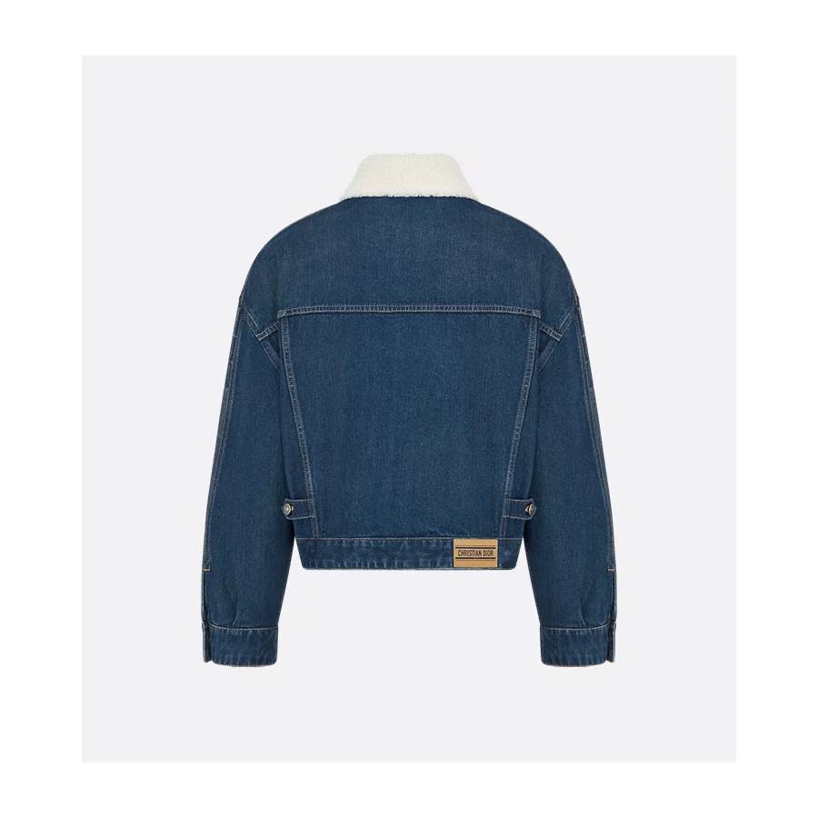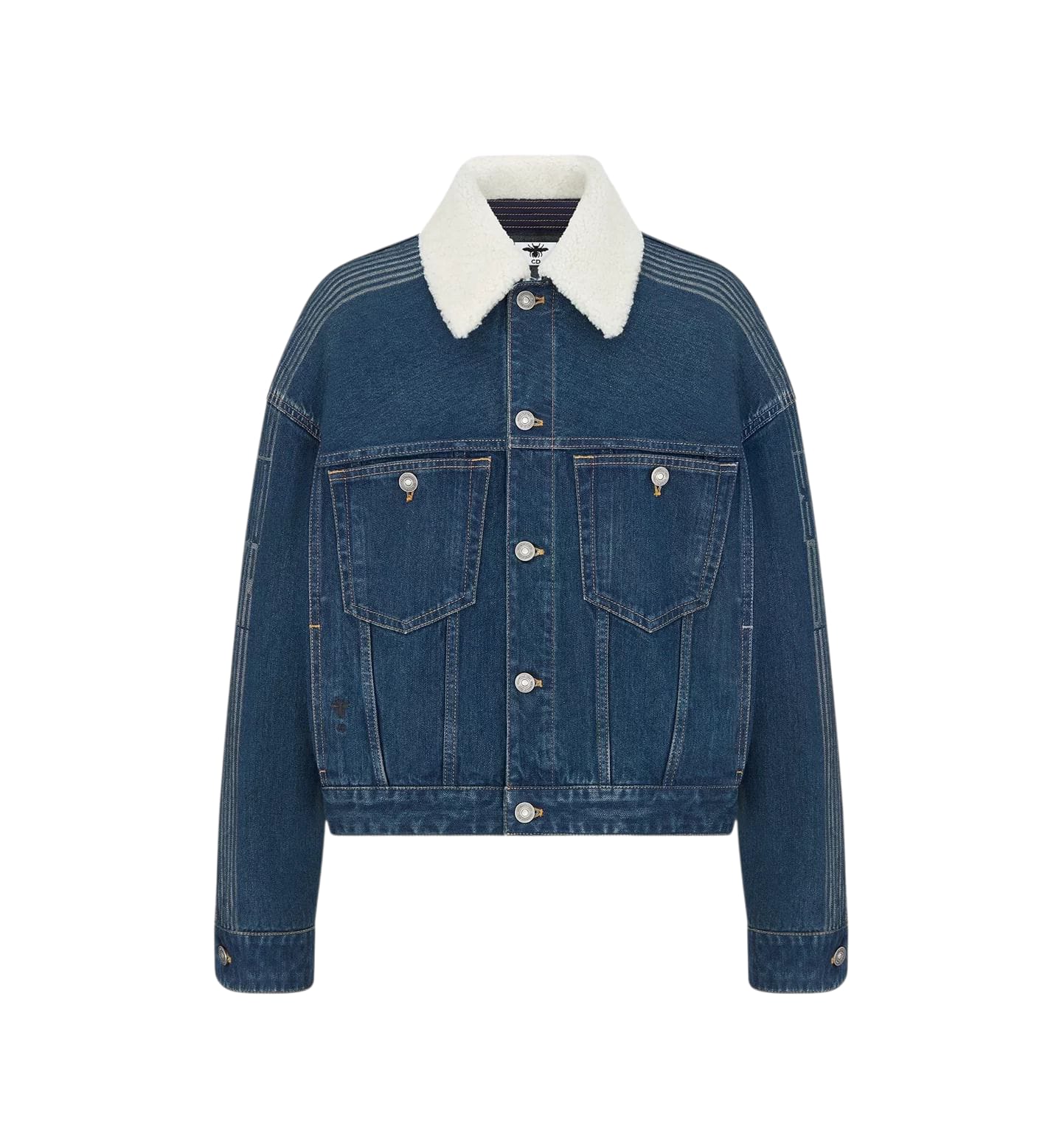 Part of the DiorAlps capsule, the jacket is a modern creation. Crafted in blue cotton denim with a white shearling-effect collar, it is distinguished by an oversized silhouette adorned with a Christian Dior Paris leather jacron label on the back. A Dior Graphique band embellishes the sides with a motif drawn from House archives and created by Marc Bohan in 1971. Completed by chest patch pockets and practical side welt pockets, the jacket can be paired with jeans or a skirt for a signature DiorAlps look.