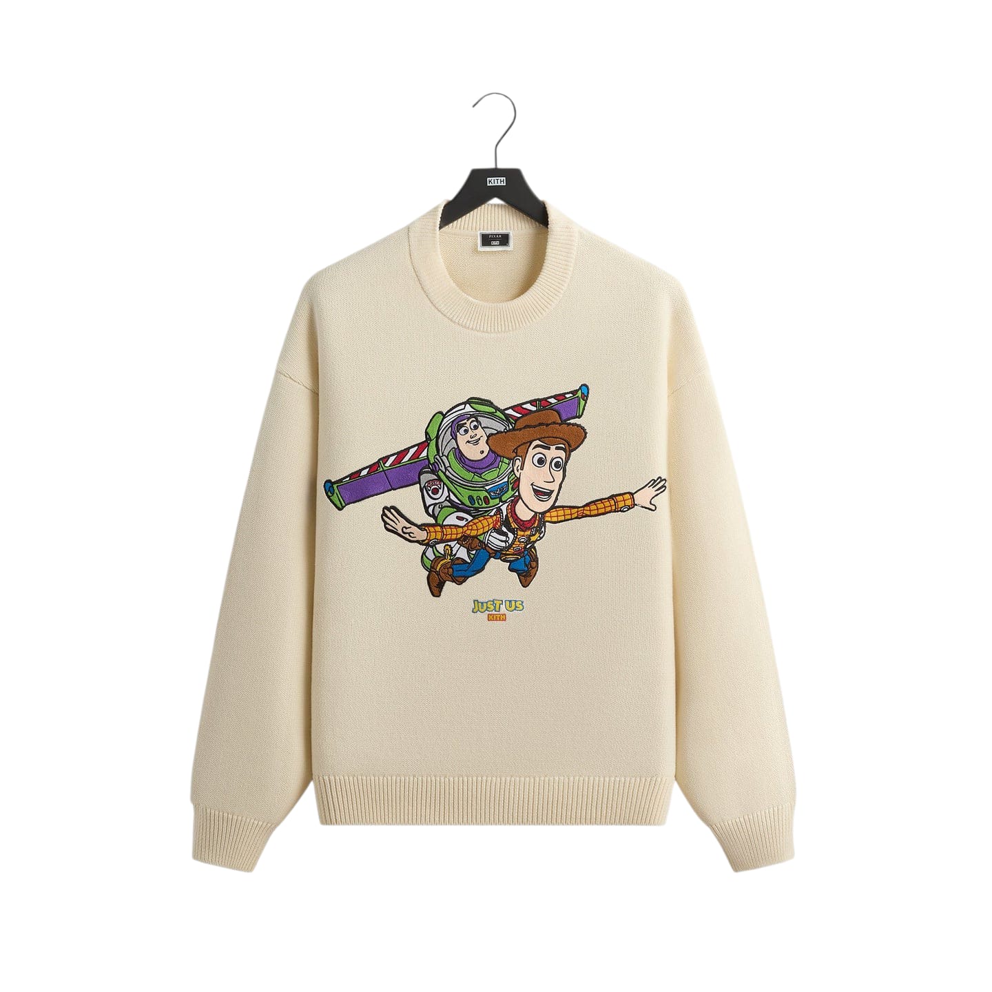 he Disney | Kith for Pixar Toy Story Lewis Sweater is crafted of cotton, featuring cotton chain-stitched artwork on the front, satin-stitched artwork on the back neck, and a ribbed neckline, sleeve cuffs, and hem.