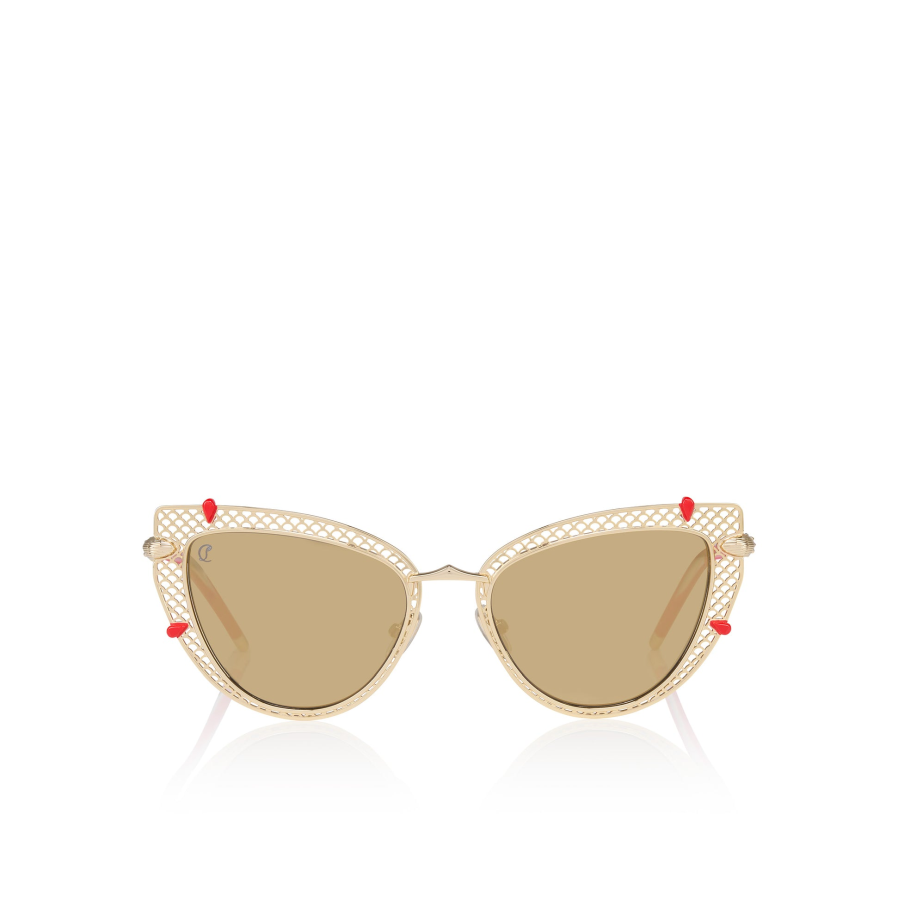 Dolly LB0002 is one of the most iconic styles of this sunglasses collection. It features a cat-eye shape with palmette pattern crafted metal on the frontal grabbed by tiny red sole signifier. Art deco inspired metal temples with palm detail on the hinge. This model is made in pale gold color with smoke gold mirrored lenses. High-performance Zeiss lenses offering exceptional quality comfort and durability for Christian Louboutin collection.