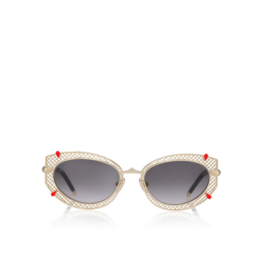This model features a pale gold metal style with an oval shape. A palmette pattern embellishes the frontal profile grabbed by tiny red soles signifier combined with the high-performance Zeiss smoke gradient lenses that offer exceptional quality, comfort, and durability for the Christian Louboutin collection.