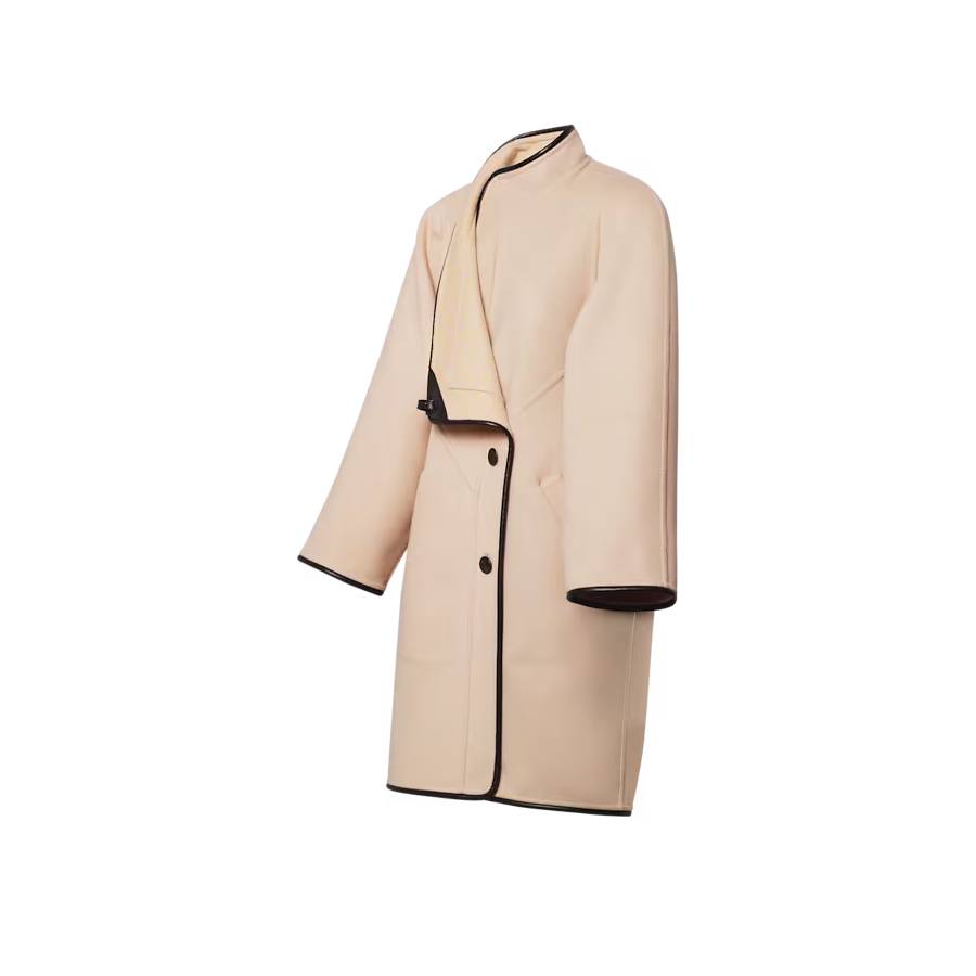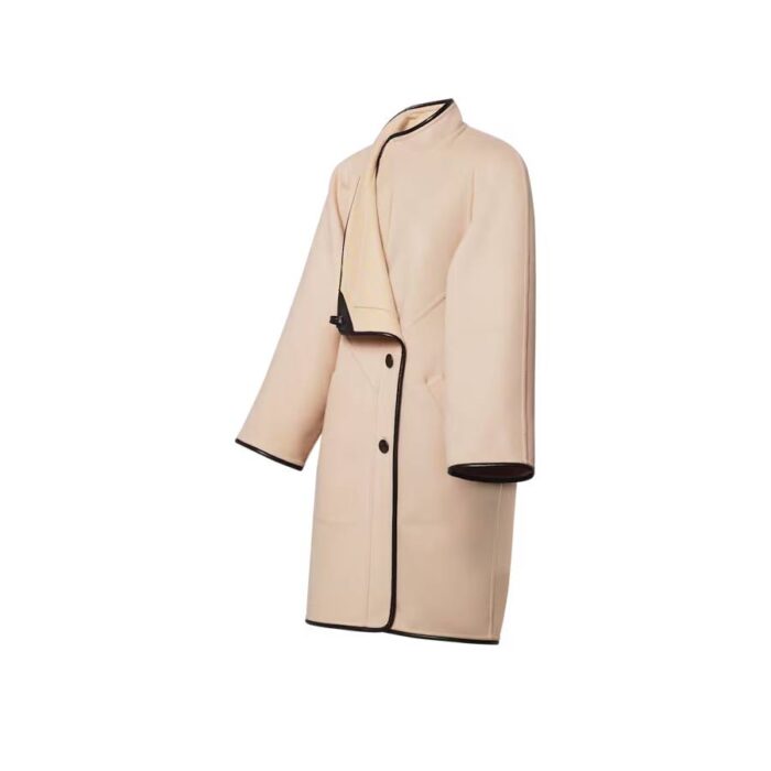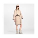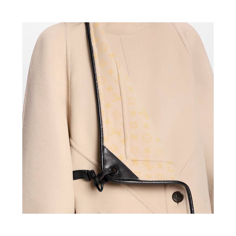 This coat projects modern elegance in the House’s signature double-face wool-silk blend finished with contrasting leather piping and visible seam details for a structured look. Cut in a boxy, straight shape with an elegant standing collar, the front is held open with a carabiner clip to reveal a subtle Monogram canvas accent inside. Complete with two practical pockets.