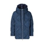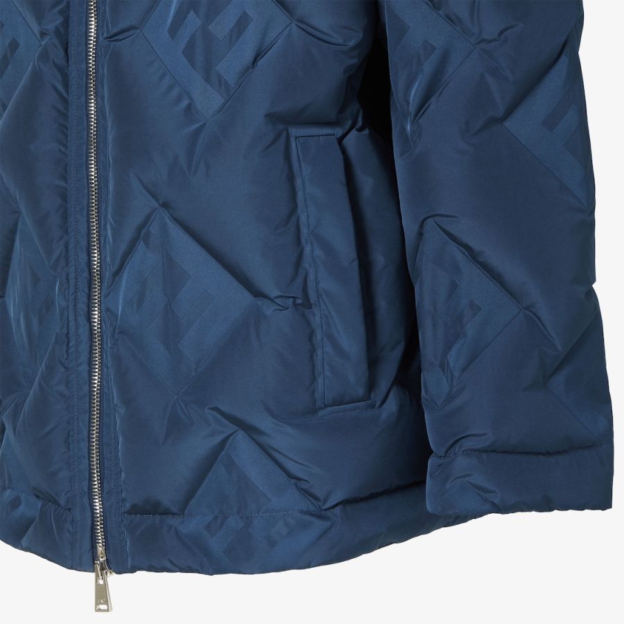 Oversize down jacket with drawstring hood and side pockets. Zip fastening with double slider. Made of dark blue technical fabric with an embossed-effect, all-over diagonal FF Jacquard motif. Palladium-finish metalware.