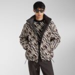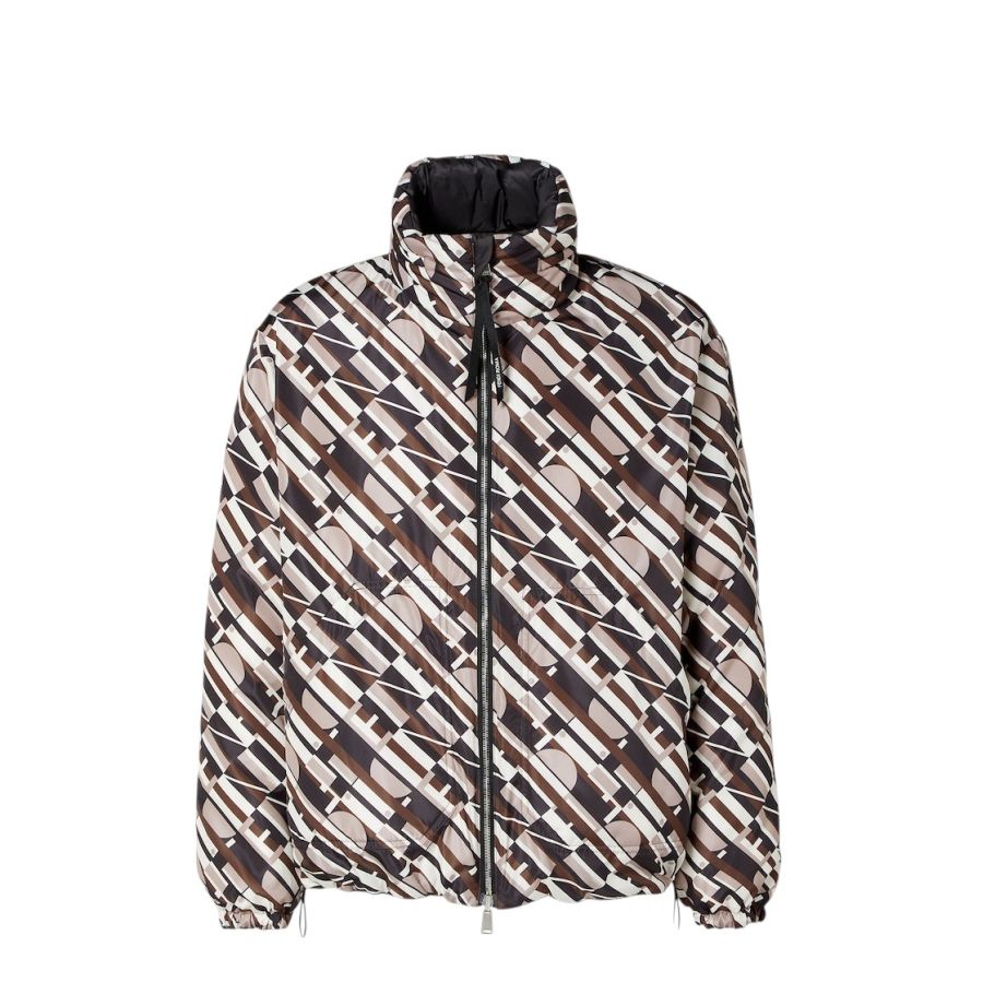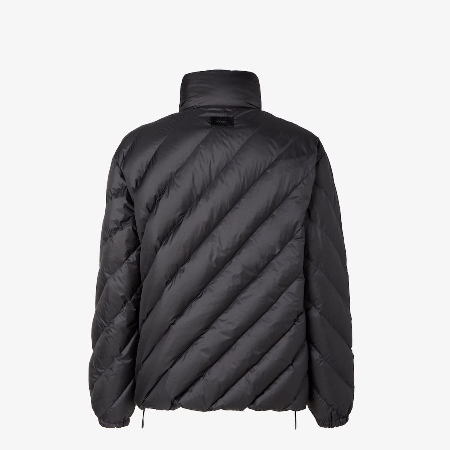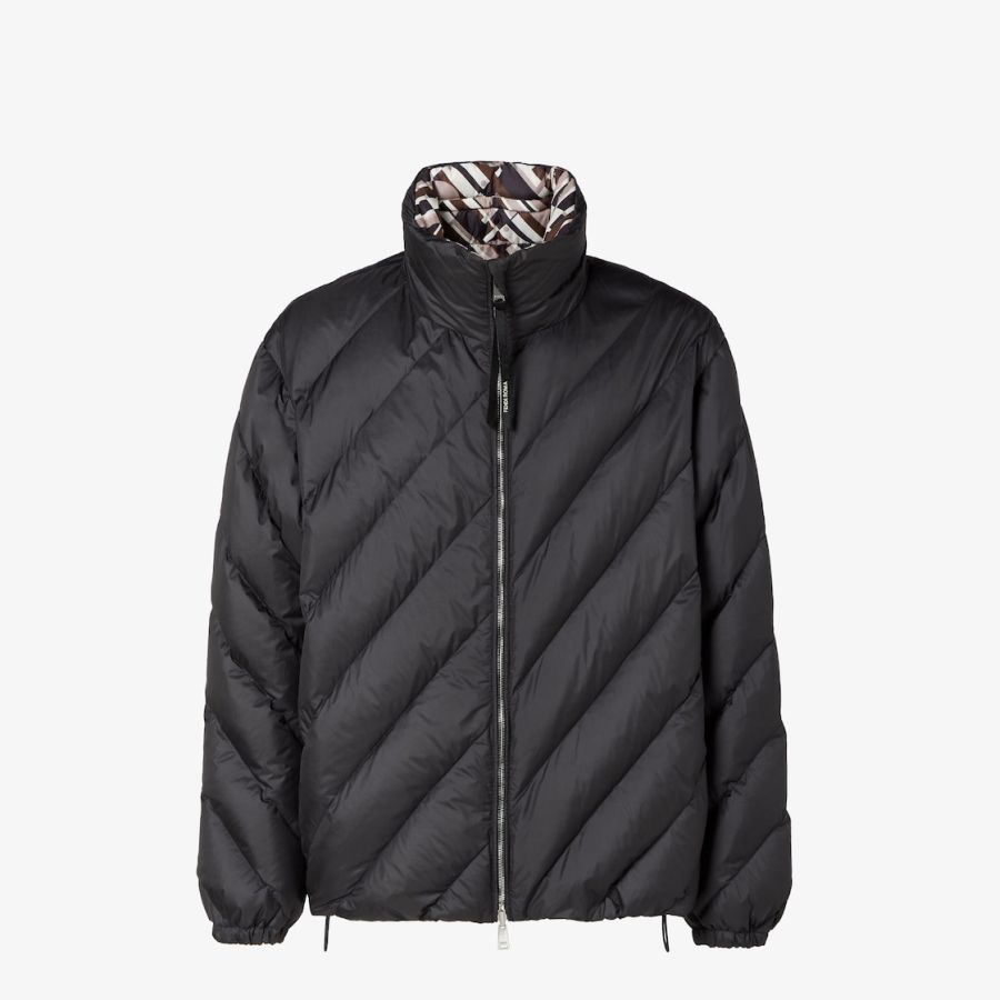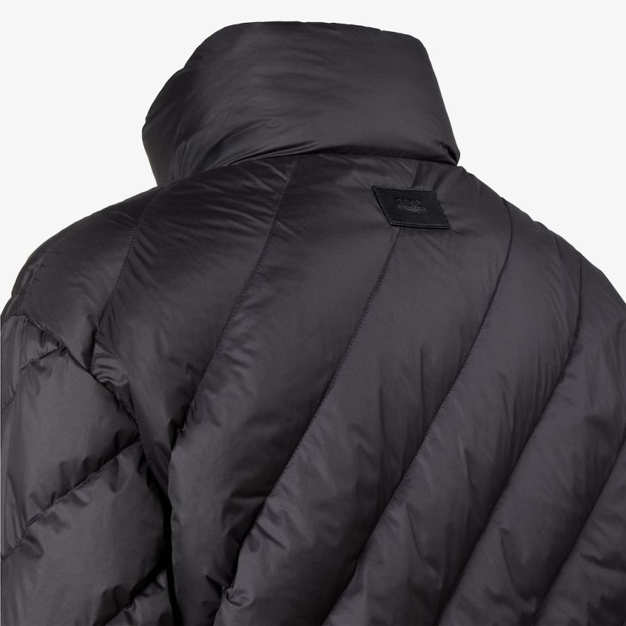 Long-sleeved down jacket with internal hood integrated in the high collar with zip. Elasticated cuffs and drawstring hem. Front fastening with double slider zip. Made of black nylon with quilted Chevron and leather Fendi Roma patch on the back of the collar. The interior is customised with an all-over Fendi Tape print in various shades of brown. Palladium-finish metalware.