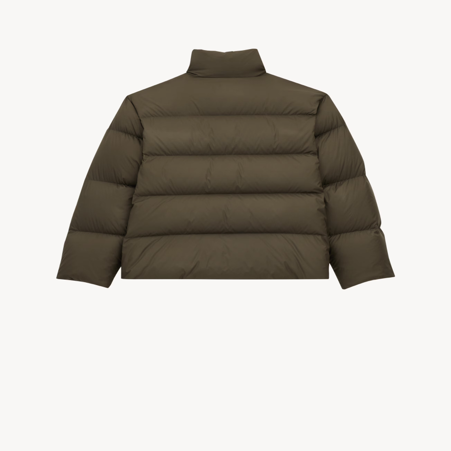 short down puffer jacket with a stand collar and rib-knit cuffs.