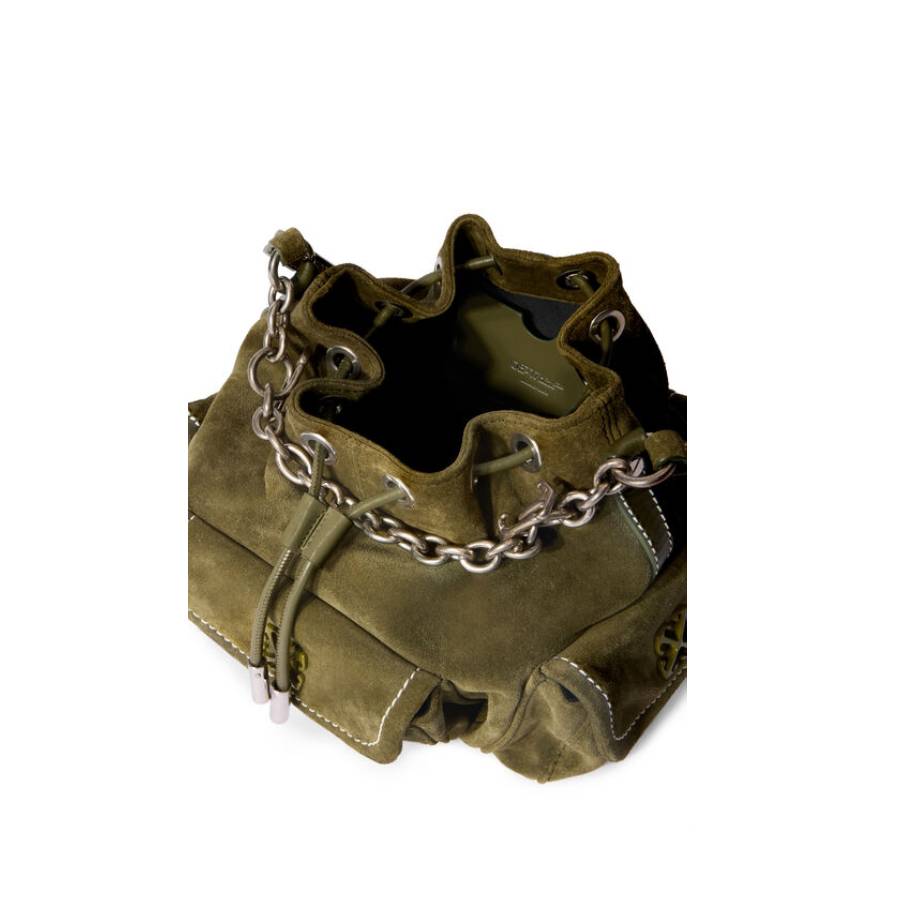 Exquisitely crafted in sumptuous suede, the Dumbo.B Bucket Bag melds urban sophistication with functional design. Its structured silhouette is accentuated by a robust chain strap and distinctive logo motif.