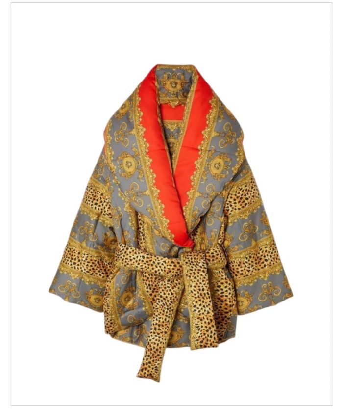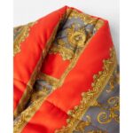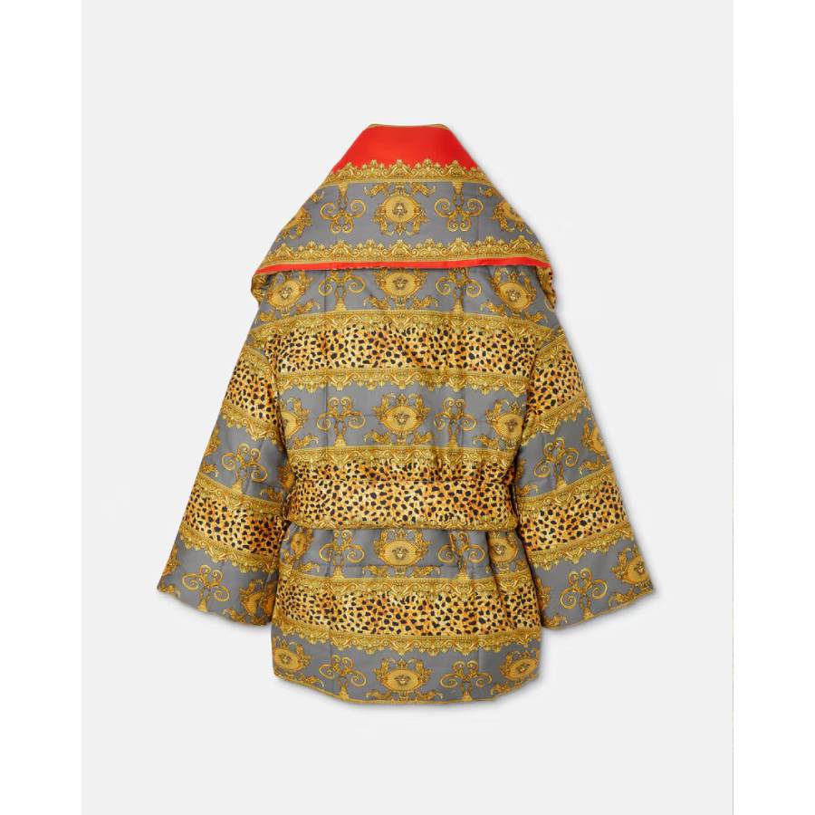 A reversible, padded oversized puffer jacket from the runway featuring an animalier pattern with Barocco motifs. The outerwear style has a wide shawl collar and belted waist, a nod to the iconic Versace Home inspiration of the collection.