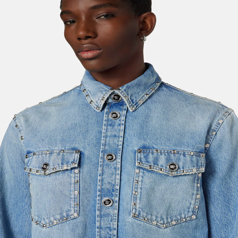 This long-sleeved denim overshirt in a light stonewashed finish features accent stud detailing and enamel Medusa snap buttons.