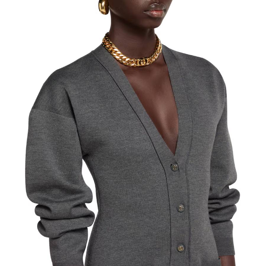 The Pre-fall 2025 collection introduces a new take on warm materials on sophisticated knitwear pieces, in traditional and contemporary silhouettes. This cardigan appears in extra fine wool with gold-toned Double G buttons.