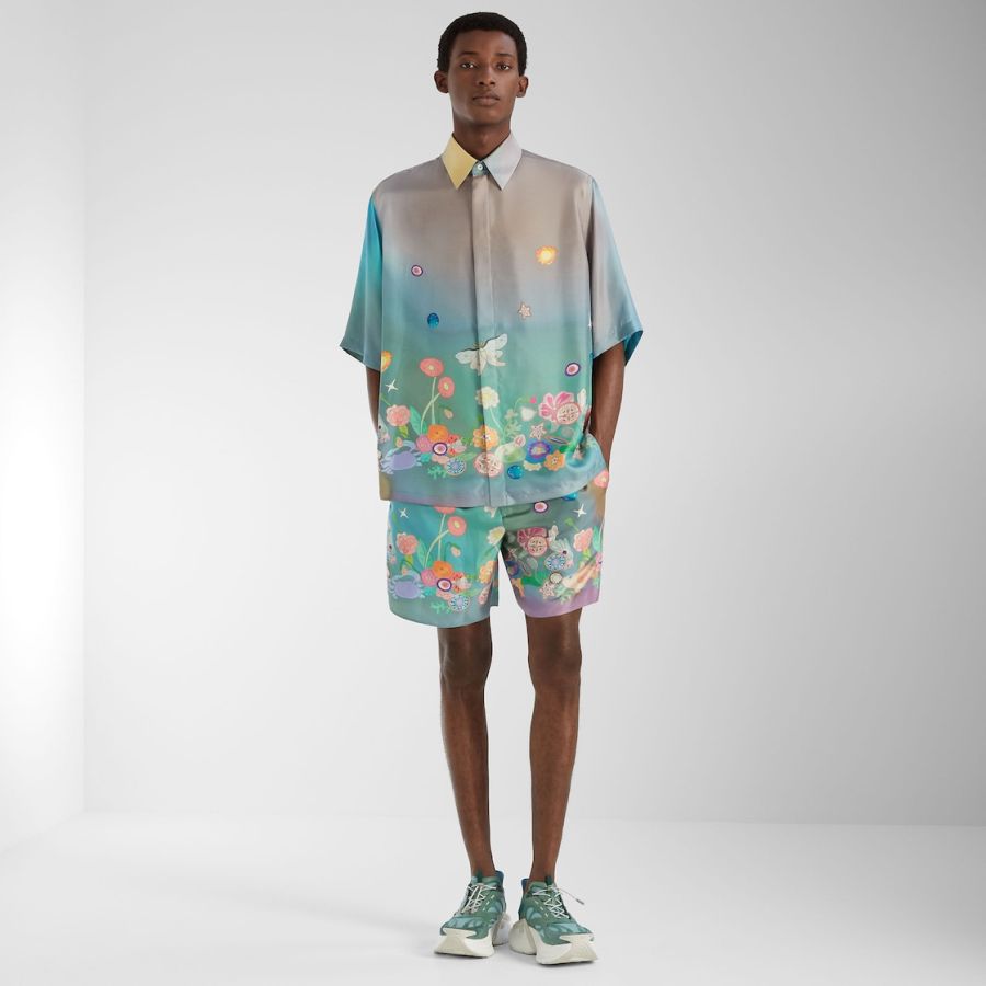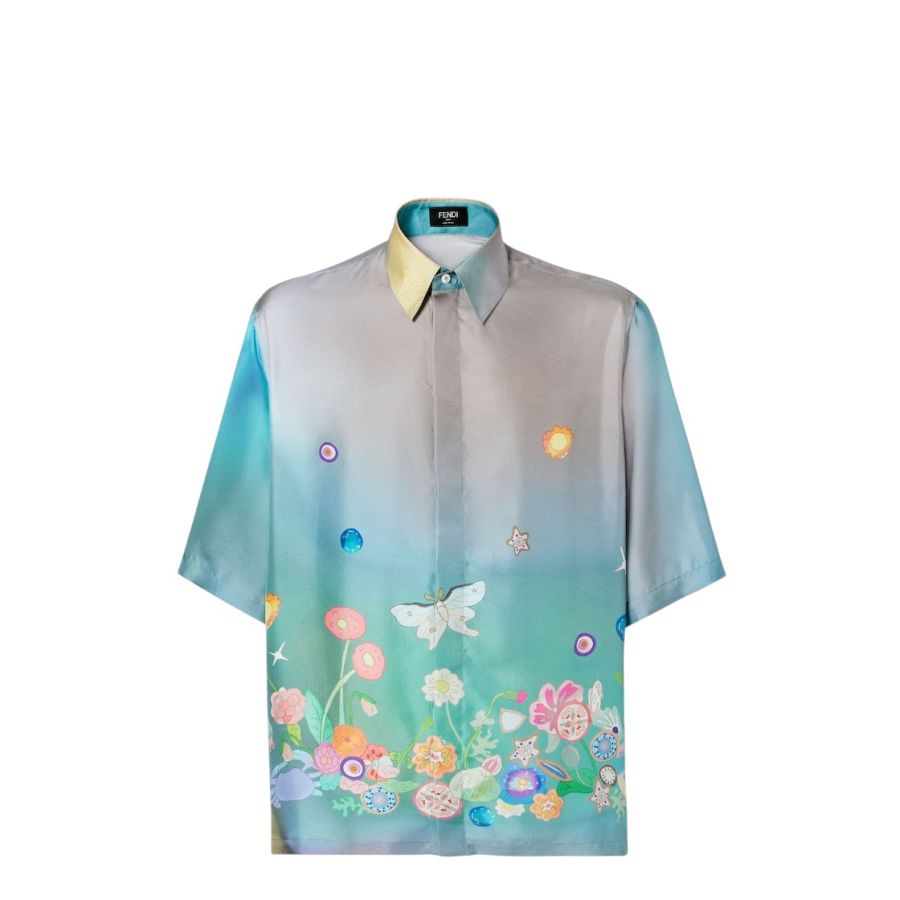 Short-sleeved, oversize shirt. Mid Italian collar and straight hem. Concealed button fastening. Part of the “Fantastic Fendi Future” capsule collection designed in collaboration with Japanese artist AYA TAKANO, it is made of graduated light blue silk with a multicolour Fantastic Flowers print.